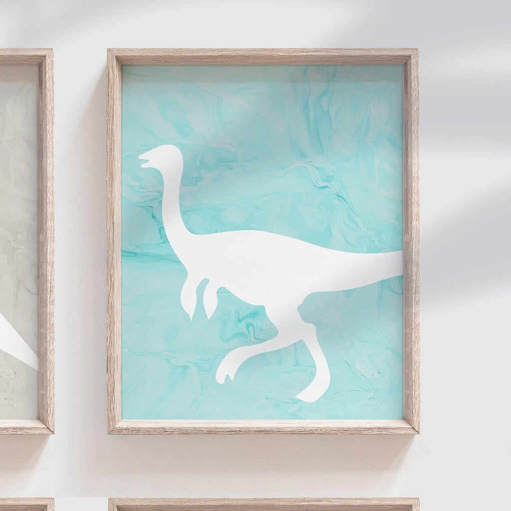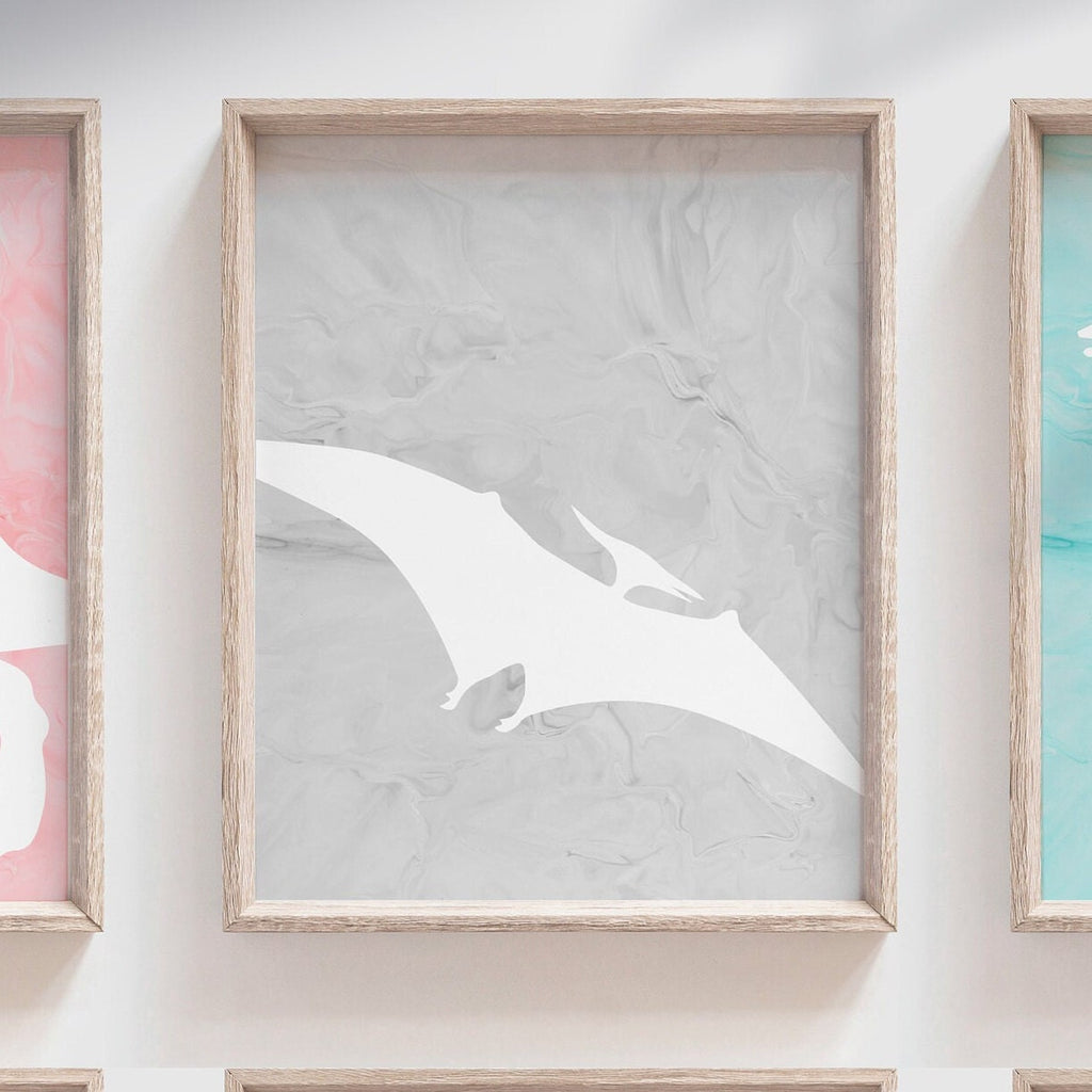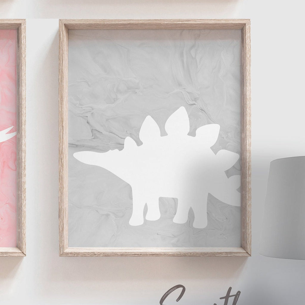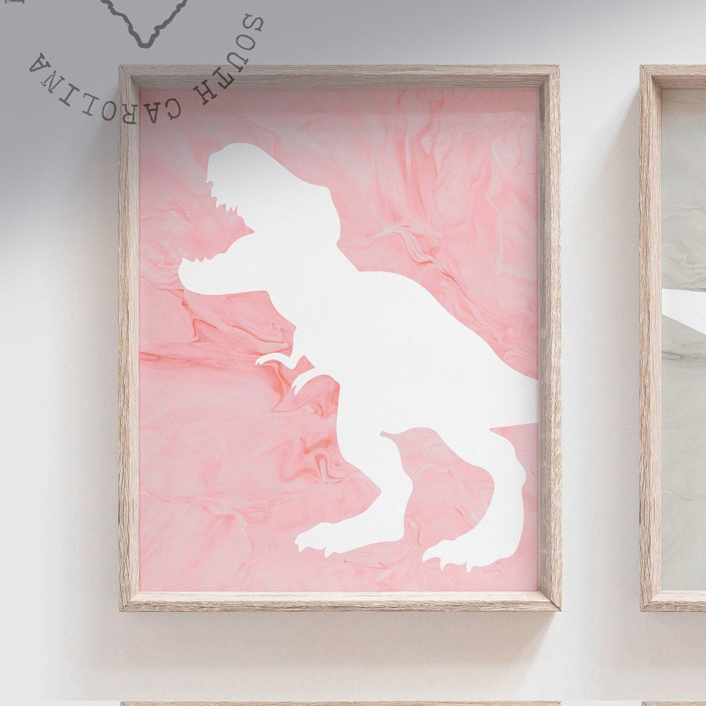 Product description: Dinosaur silhouettes in white with pink, aqua blue and gray marbled backgrounds. Alternative option features pink and gray only. Other color options are also available in my shop.
