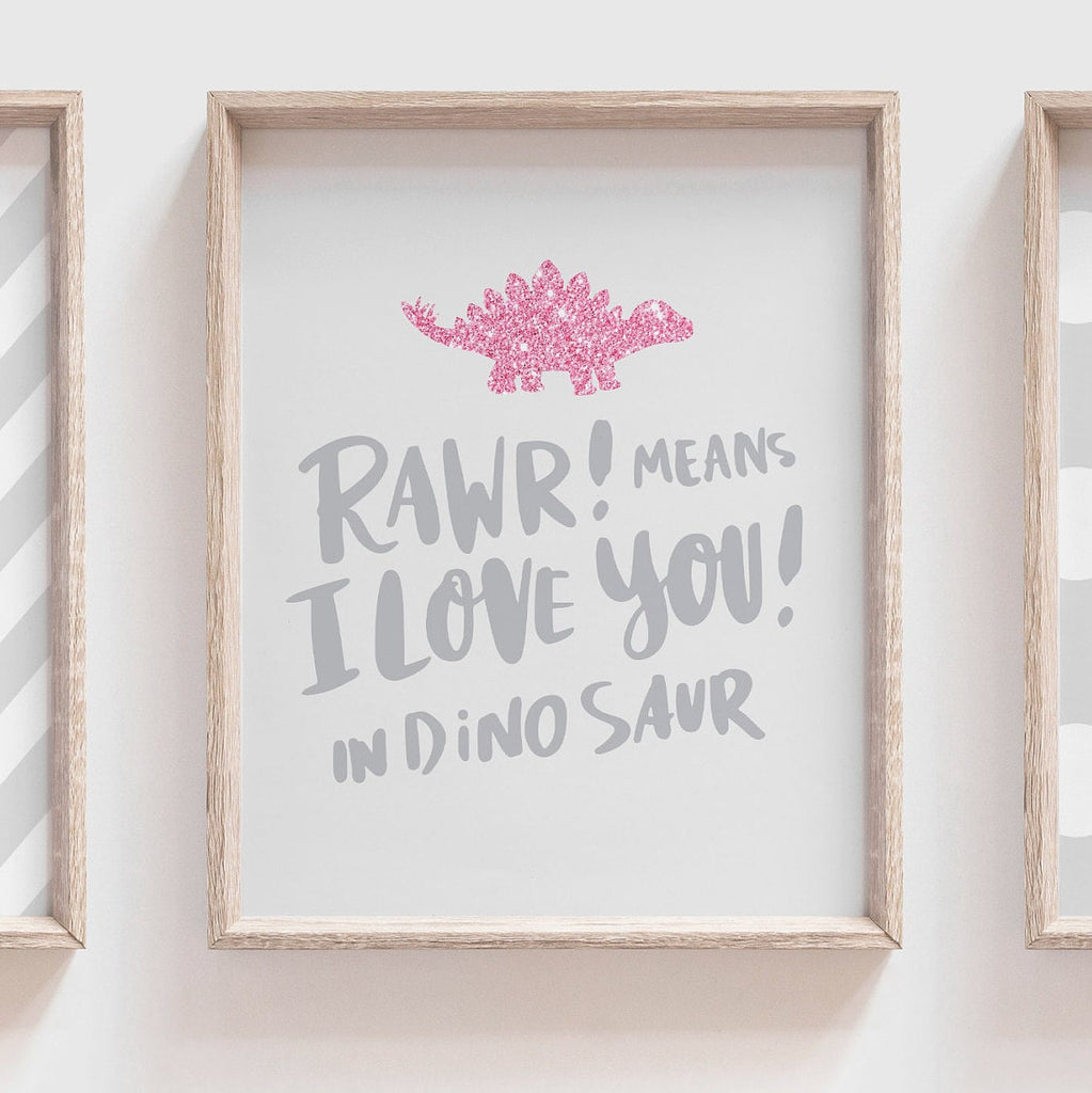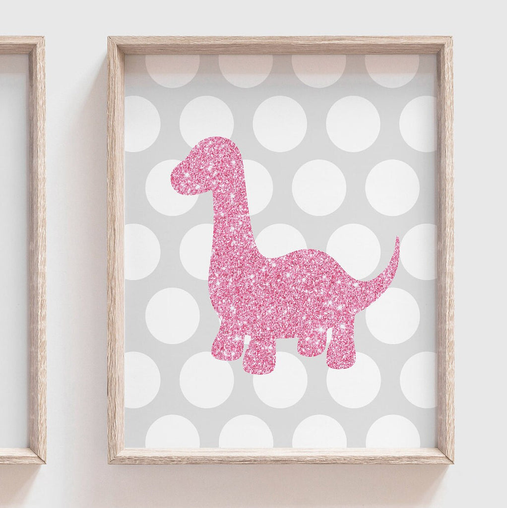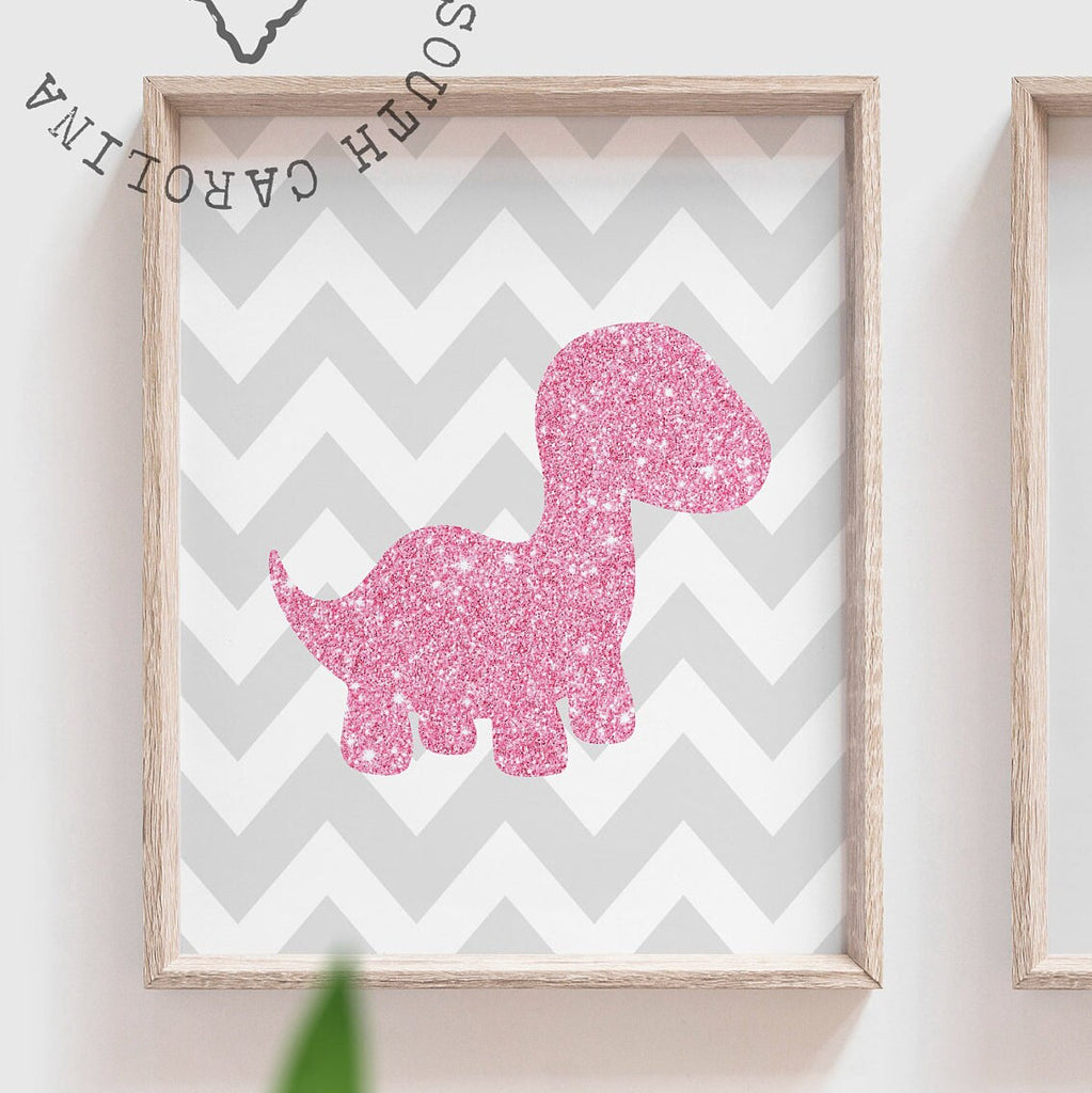 Pink gray girls dinosaur nursery art, girl pink sparkle dinosaur art, baby girl dinosaurs, girl dinosaur wall art, girls bedroom dinosaurs
