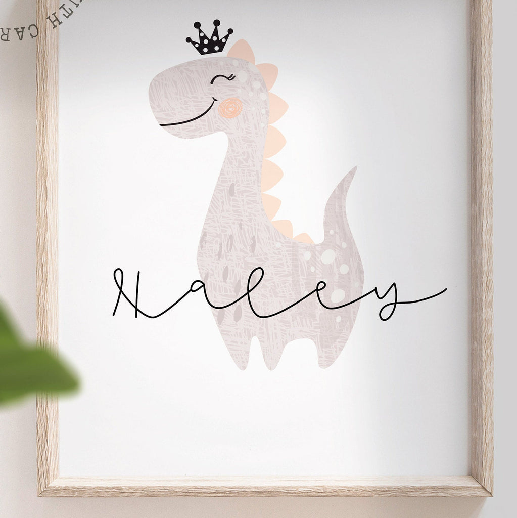 Product description: Dinosaur themed print to be customized with your child's name in script. Additional options are also available in my shop.