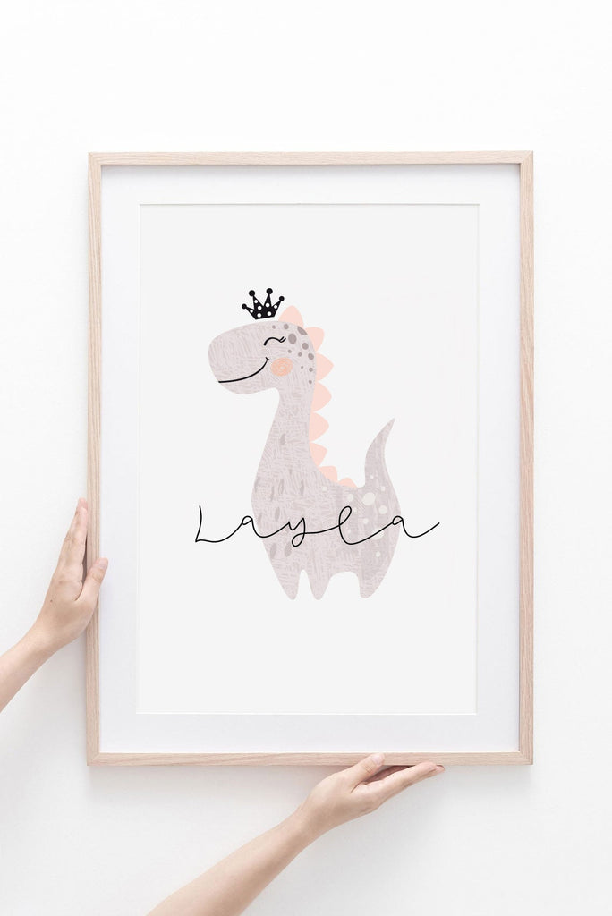 Purple princess dinosaur art, girls name dinosaur nursery print personalized, shower girl dinosaur themed gift, sweet girl dinosaur gift art