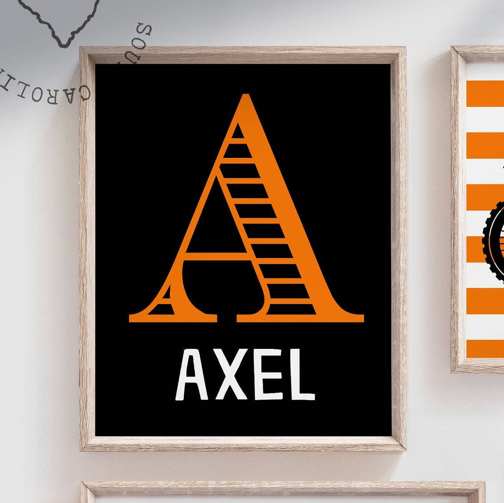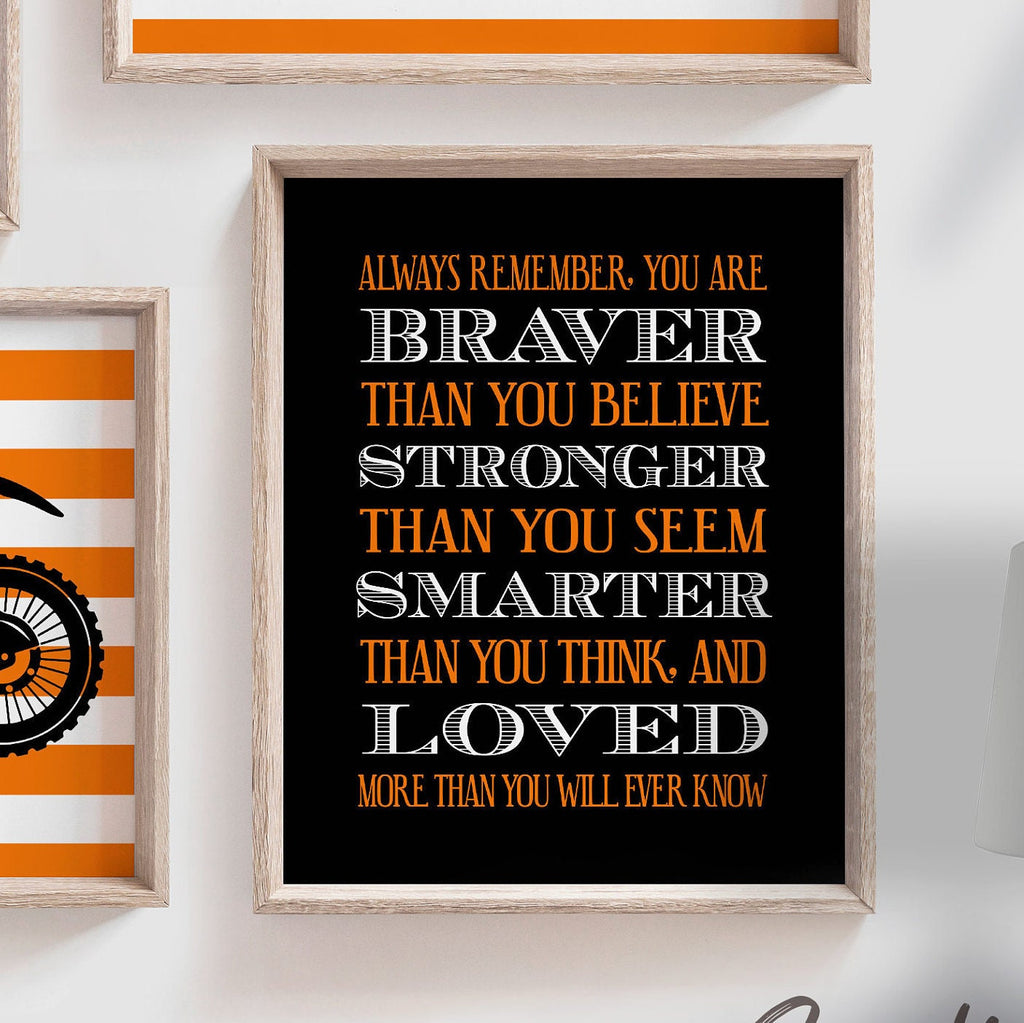 Product description: Dirt bike art prints in black and orange with striped backgrounds, matching personalized monogram and quote reading, "Always remember, you are braver than you believe, stronger than you seem, smarter than you think, and loved more than you know." Other options are also available in my shop.