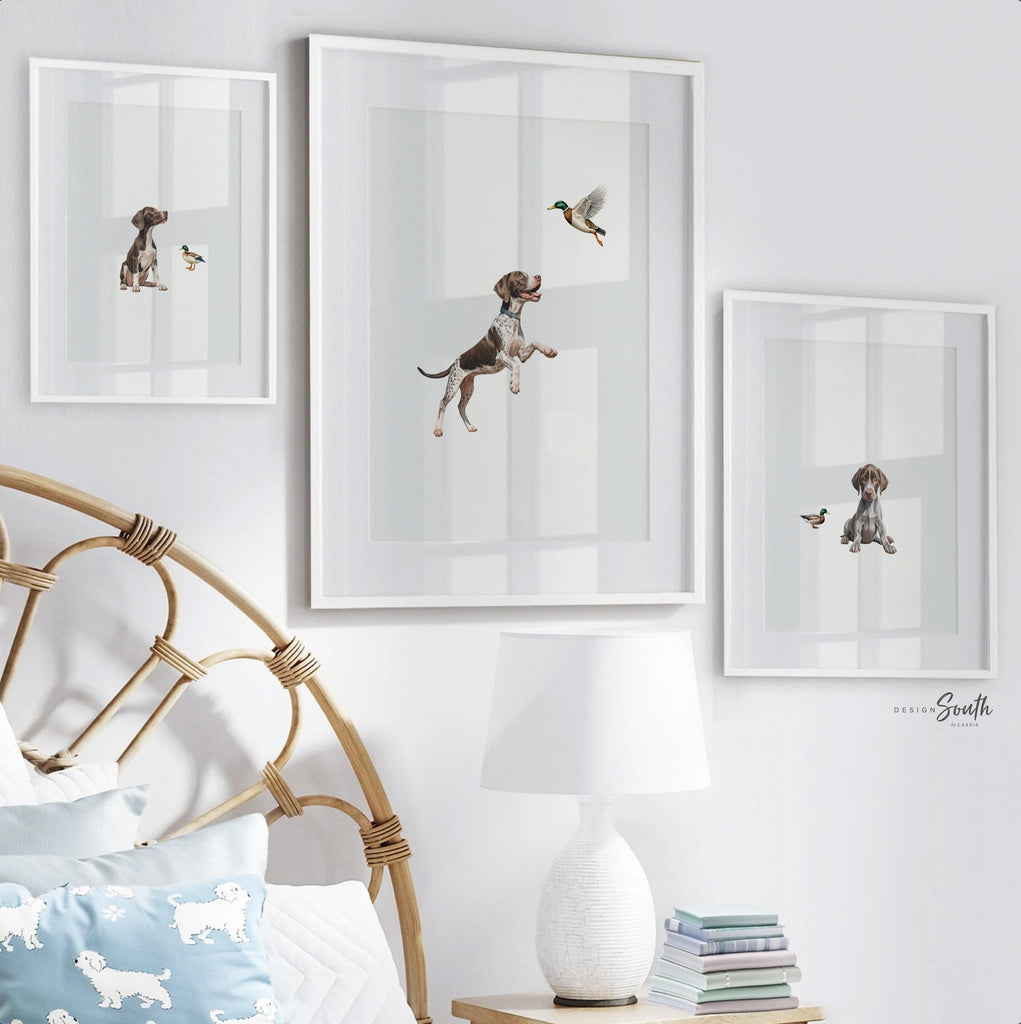 Product description: Wall art prints featuring three German shorthaired pointer puppies accented with mallard ducks. Other options are also available in my shop.