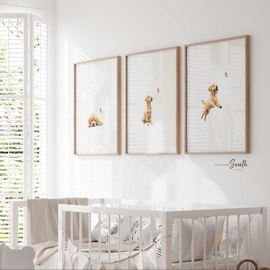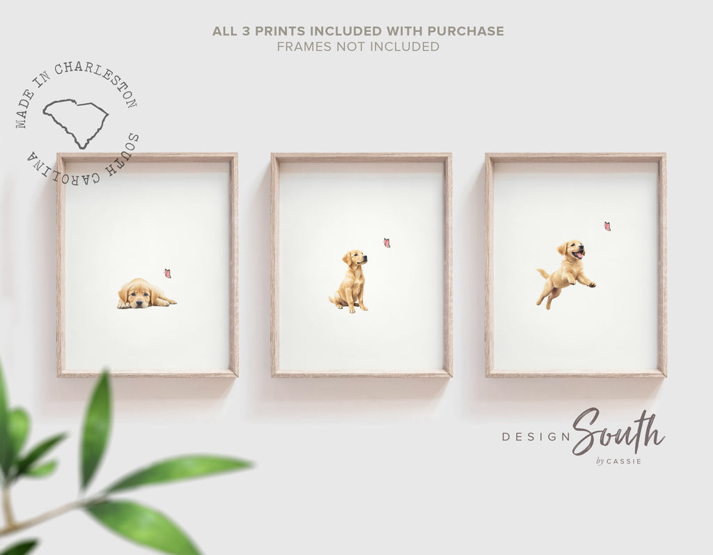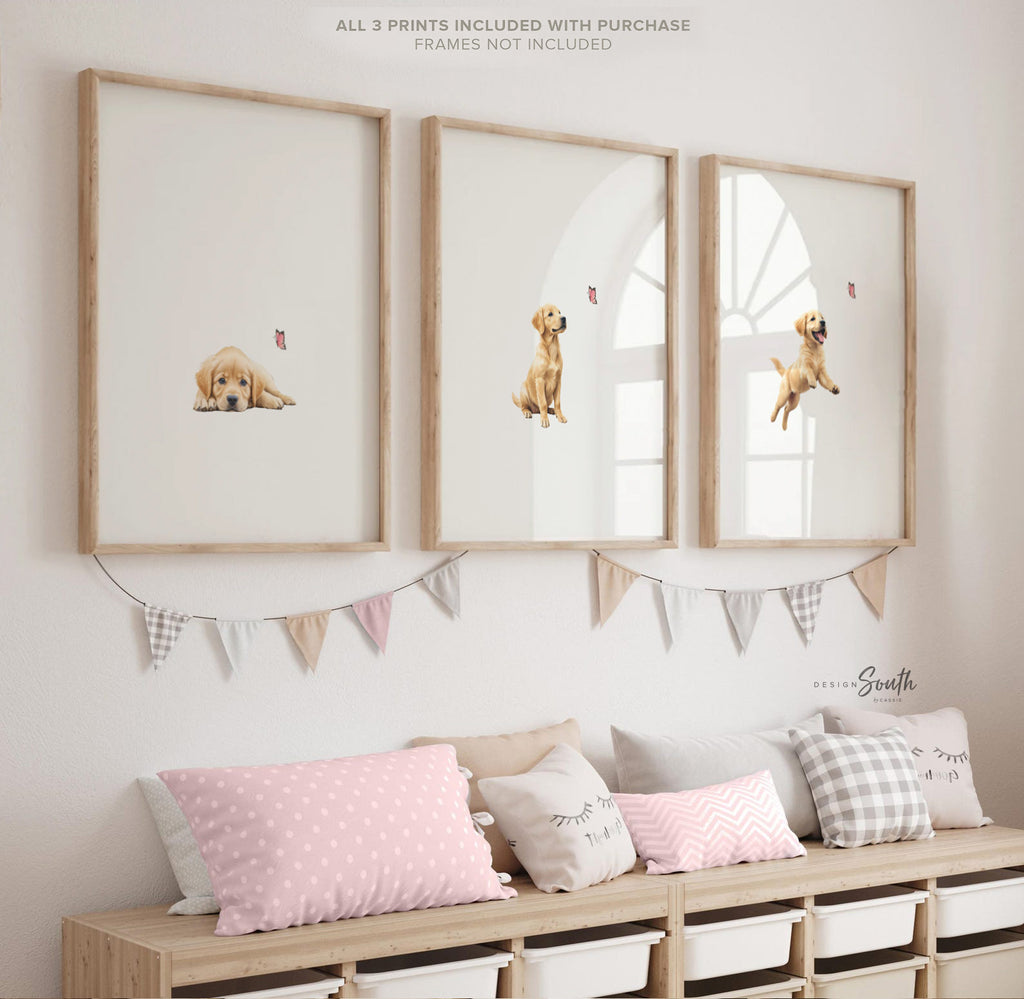 Golden retriever puppy art, pink butterfly nursery prints, set of 3 dog wall art for girls, sweet modern baby room decor