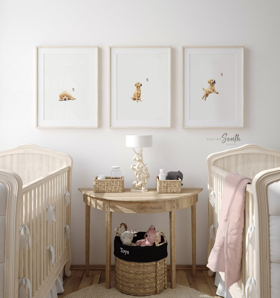 I take pride in creating all of my designs. These timeless puppy wall art prints will redefine the walls of a child's nursery, bathroom, playroom or bedroom. Each design is curated with a passion and vision to create inspired spaces for you and your little ones.