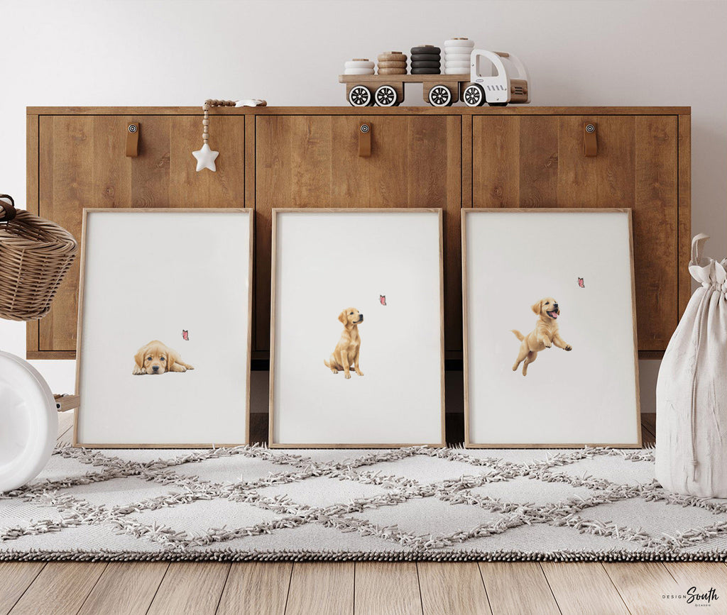 Product description: Wall art prints featuring three watercolor golden retriever puppies accented with pink butterflies. Other options are also available in my shop.