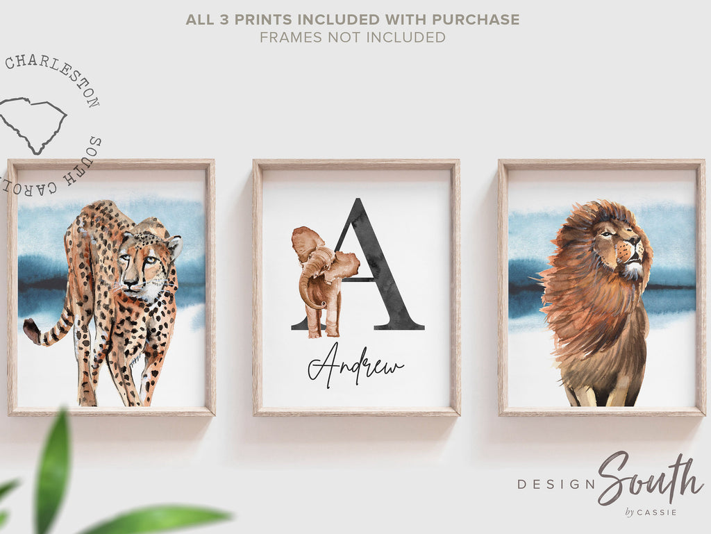 Boys name safari animal print set, lion elephant bold modern nursery, personalized big boy bedroom, little boys room animal kingdom, indigo
