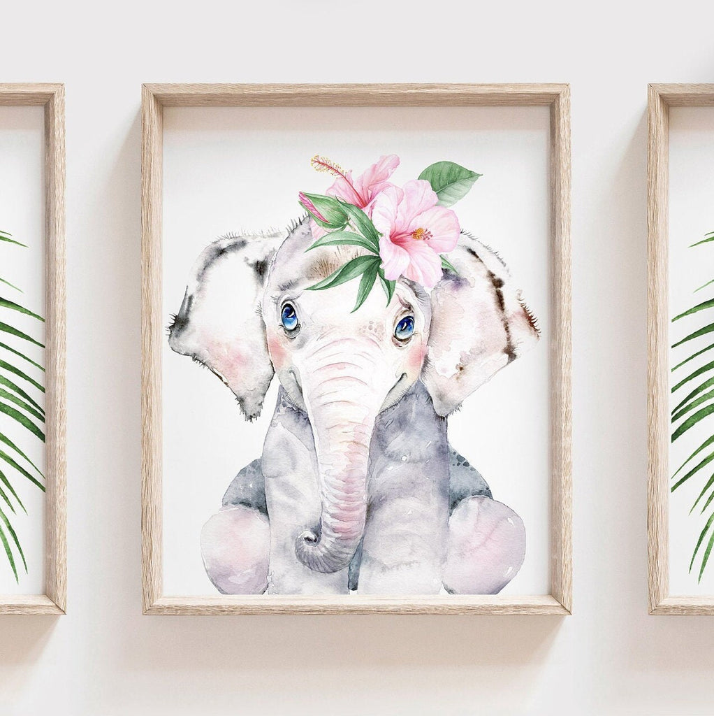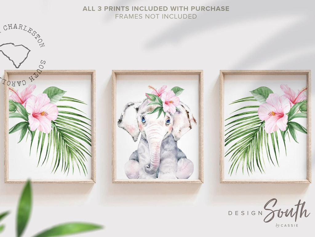 Elephant nursery wall art for baby girl, pink & gray, baby shower elephant theme gift, pink tropical leaves wall prints, watercolor nursery