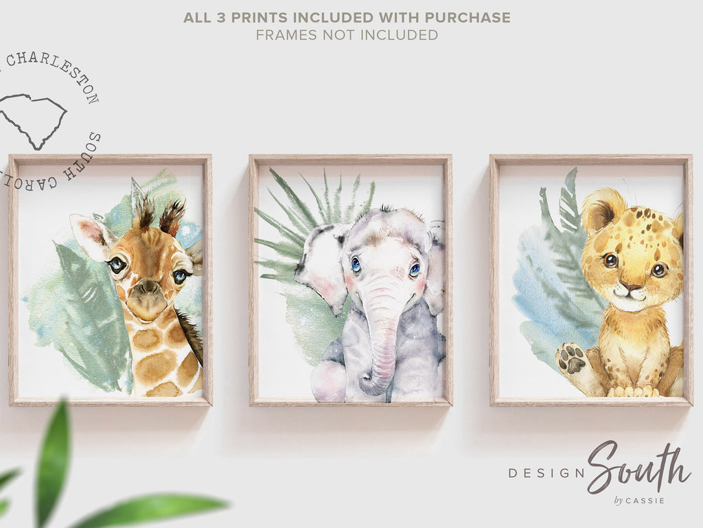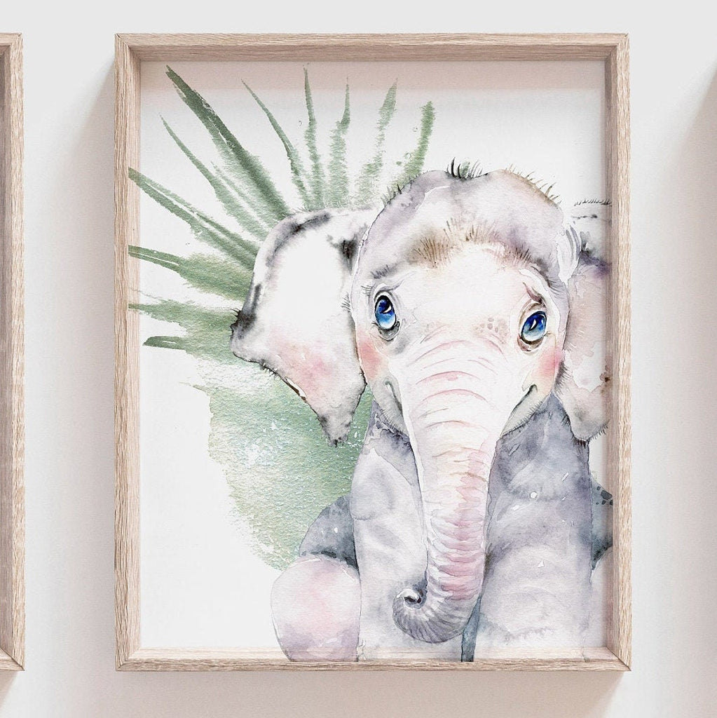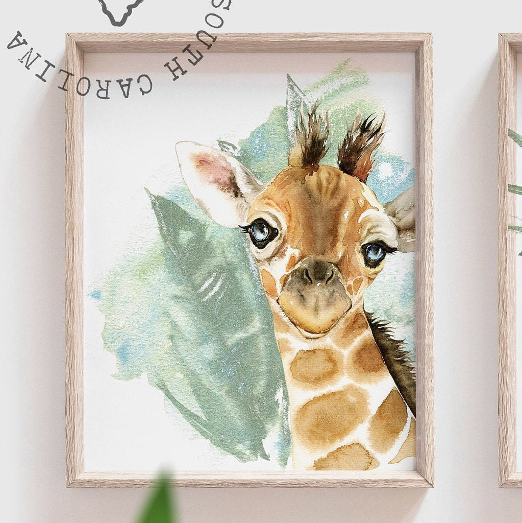 Product description: Baby animal watercolor prints featuring a giraffe, elephant and cub accented with tropical plants. Other options are also available in my shop.