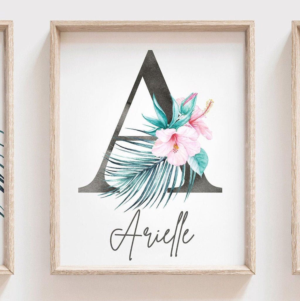Product description: Tropical themed prints in watercolor with hawaiian flowers, palm leaves, flamingo and matching monogram print to be customized with your child's name and initial. Giraffe, elephant and panda bear options are also available upon request.