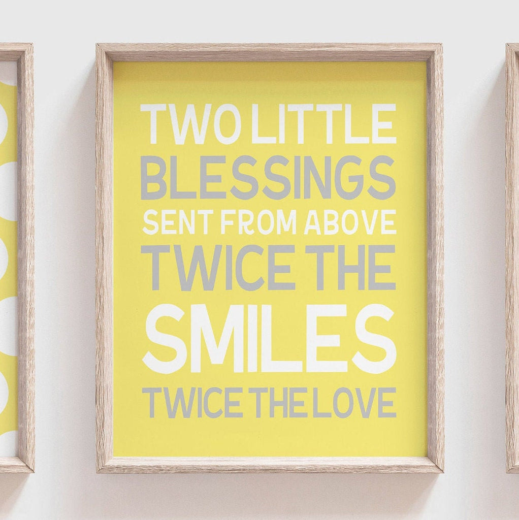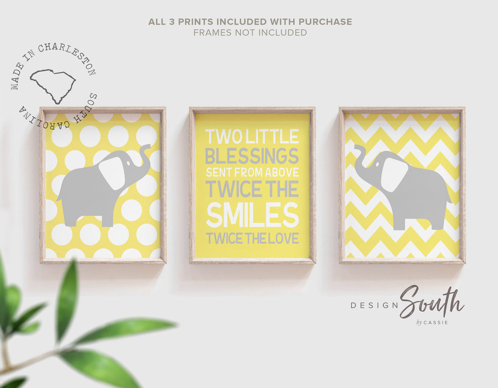Twin nursery decor, elephants for twins, quote for twins, yellow and gray nursery wall art, two little blessings, gray and yellow nursery
