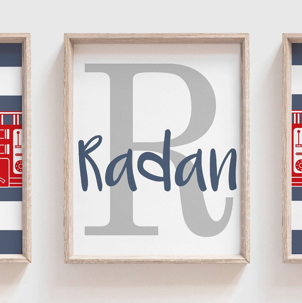 Product description: Fire truck prints in red, seagull and custom color (not on color chart) 'denim blue' with thick striped backgrounds and matching name print to be personalized with your child's name and initial. Other options are also available in my shop.