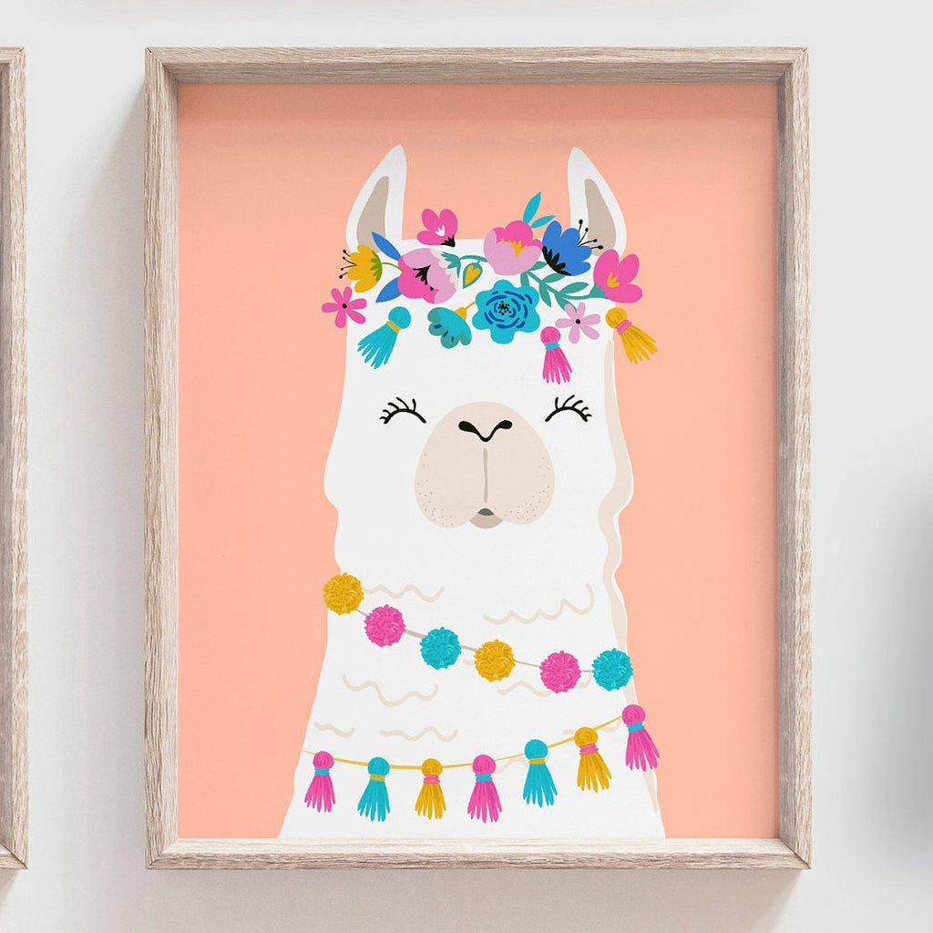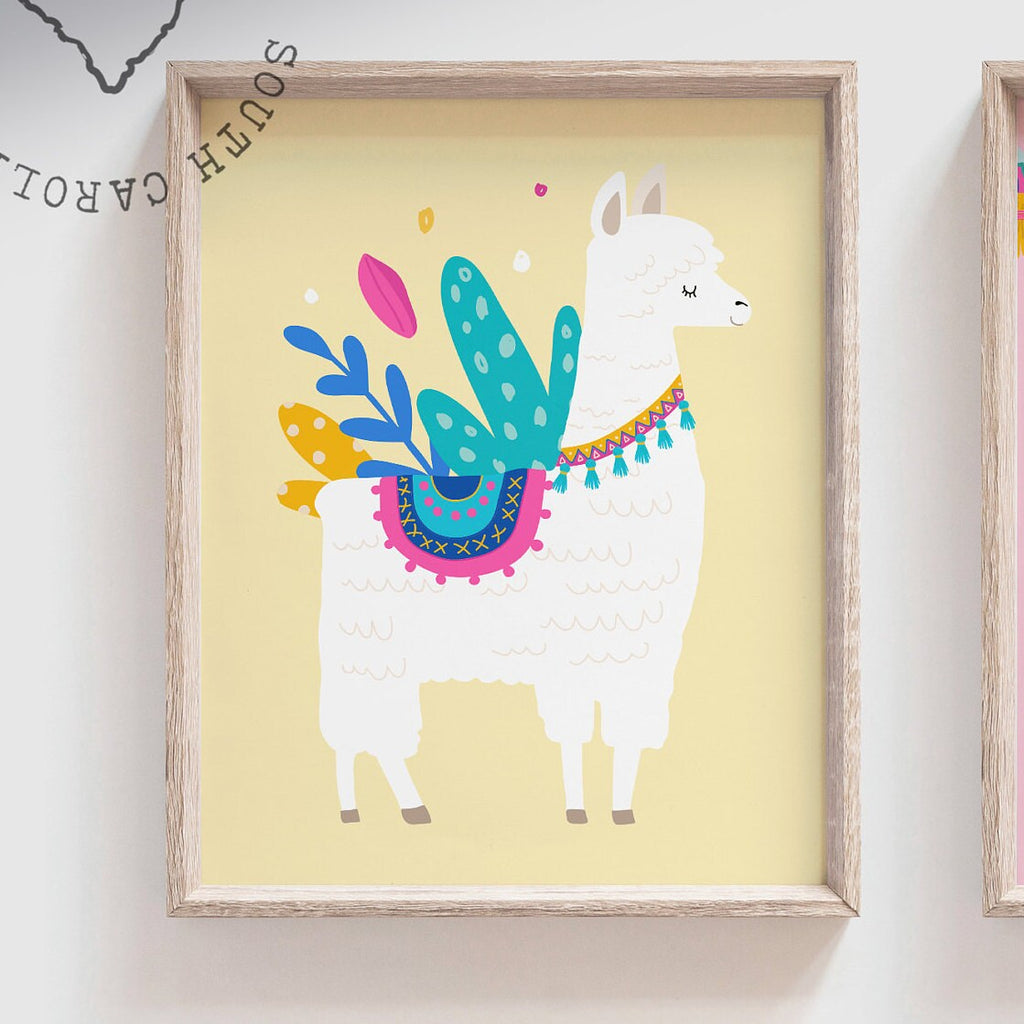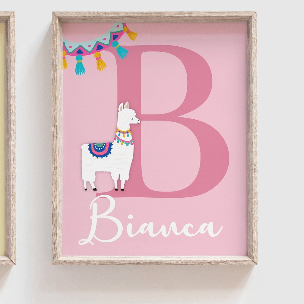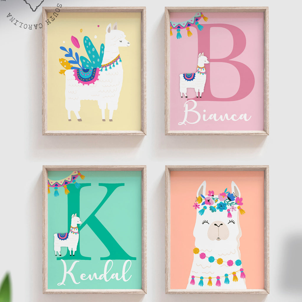 Product description: Llama theme prints with colorful succulents and personalized prints to be customized with your girls' names and initials. Other color options are also available.