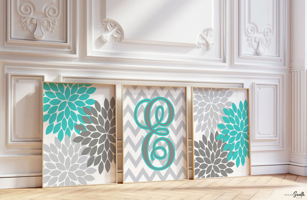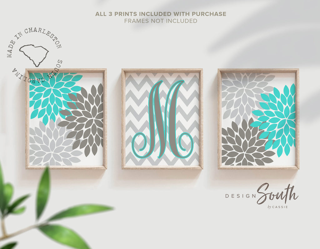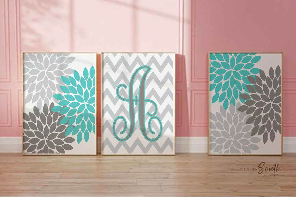 Girls bedroom wall decor turquoise and gray, little girl's monogram teal turquoise, nursery monogram girl, floral pictures for girls room