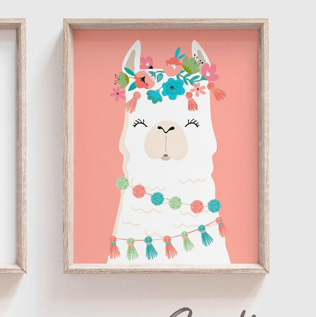 Llama themed girls bedroom, boho chic nursery art prints, llama alpaca accessories decorations, custom kids llama cactus gift personalized