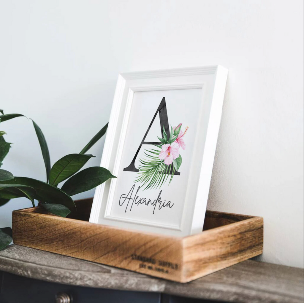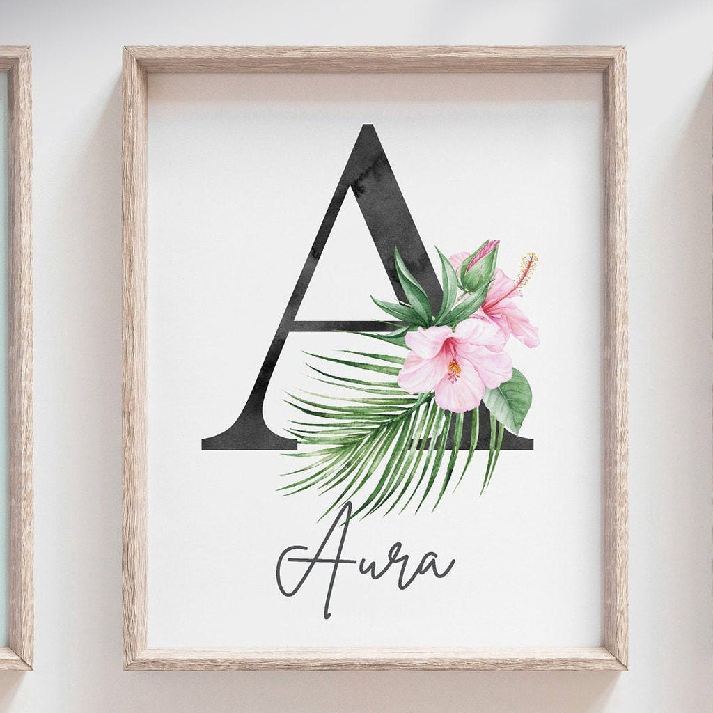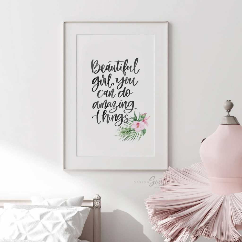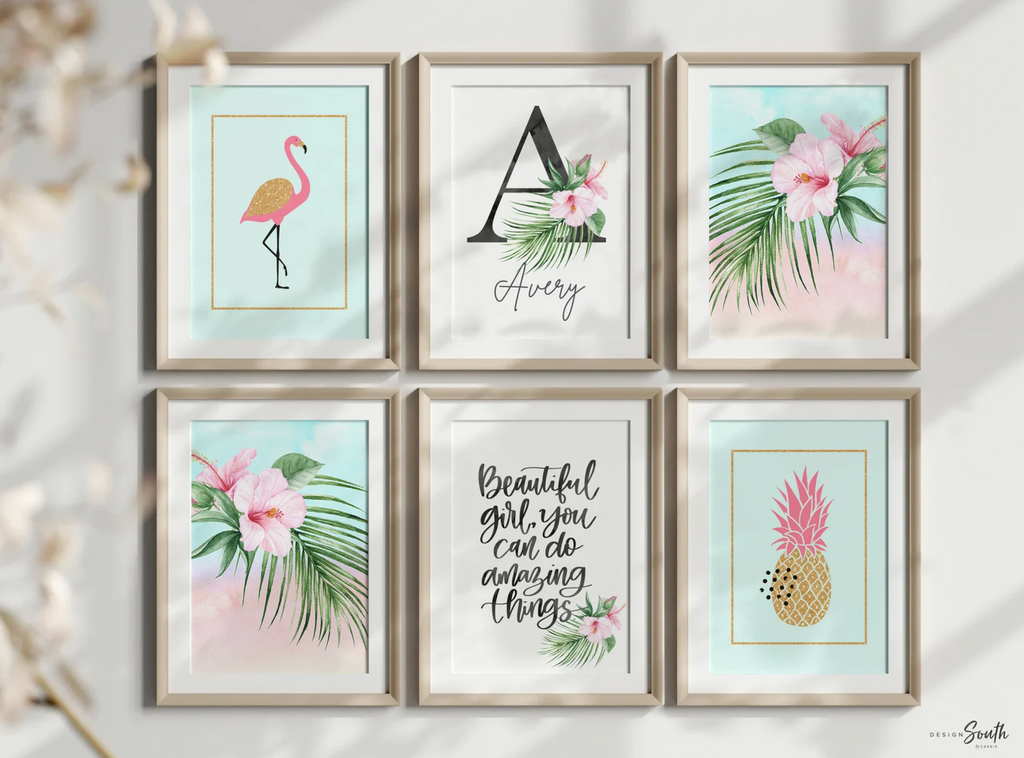 Product description: Tropical theme prints featuring a flamingo, pineapple, floral palms, personalized monogram and inspirational quote reading, "Beautiful girl, you can do amazing things." Other options are also available in my shop.