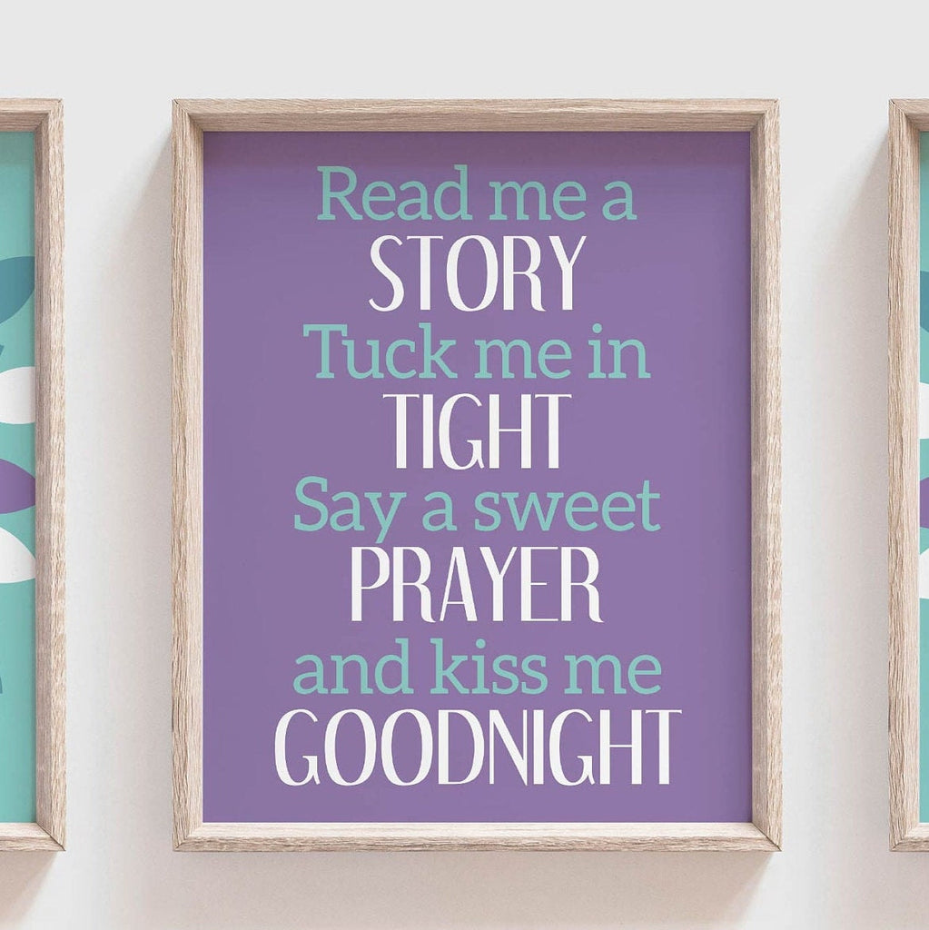 Product description: Girl's dahlia floral bursts with matching print reading, "Read me a story. Tuck in me tight. Say a sweet prayer. And kiss me goodnight." Colors used in this listing are berry, lilac, caribbean and robin egg. Other options are also available in my shop.