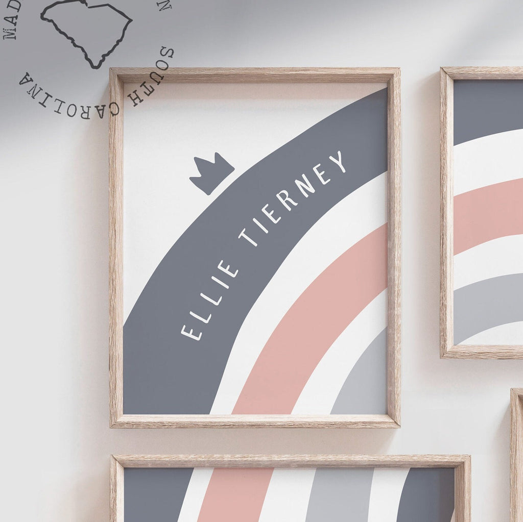 Product description: Rainbow design prints in muted shades of blue and pink with matching personalized print to be customized with your child's name. If you like this design, and not sure what your baby's name is going to be yet, you can simply state to remove it altogether, or replace with a saying such as, "you are so loved." Other options are also available in my shop.