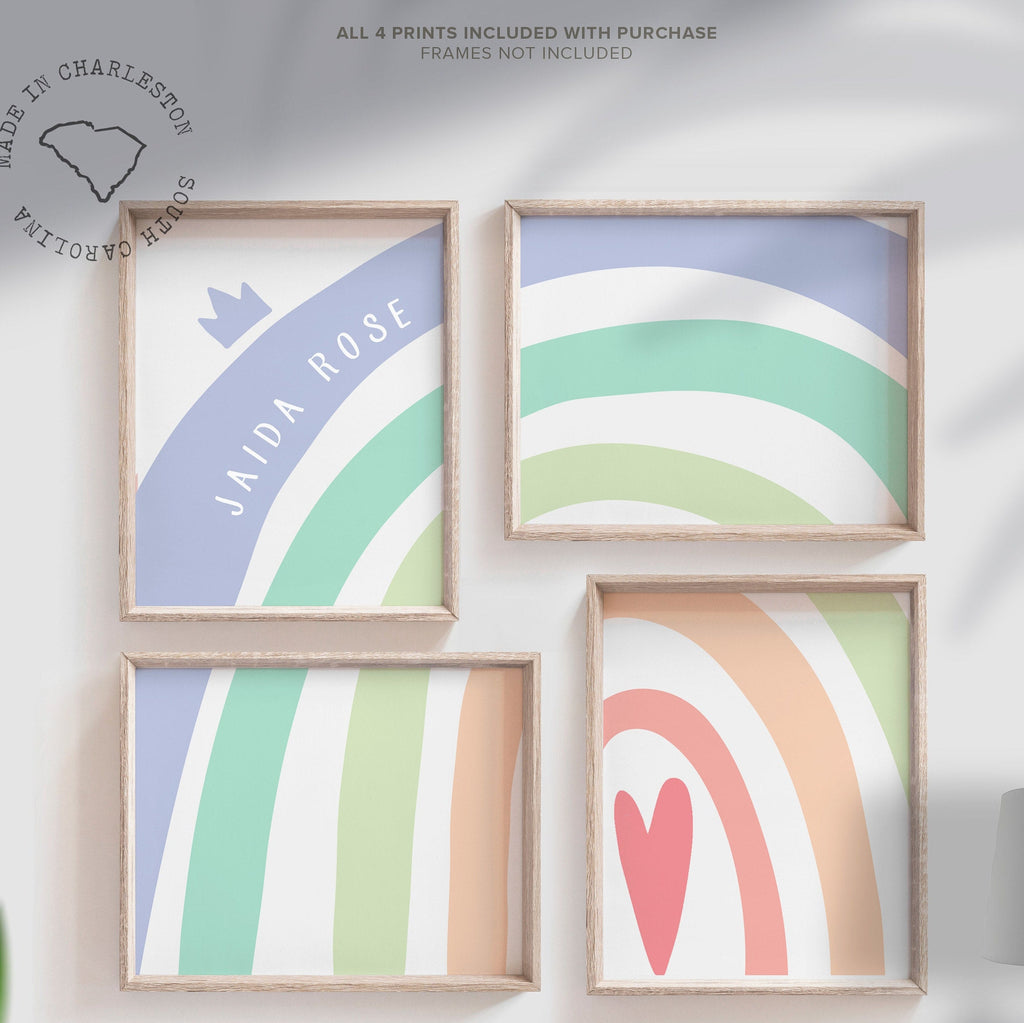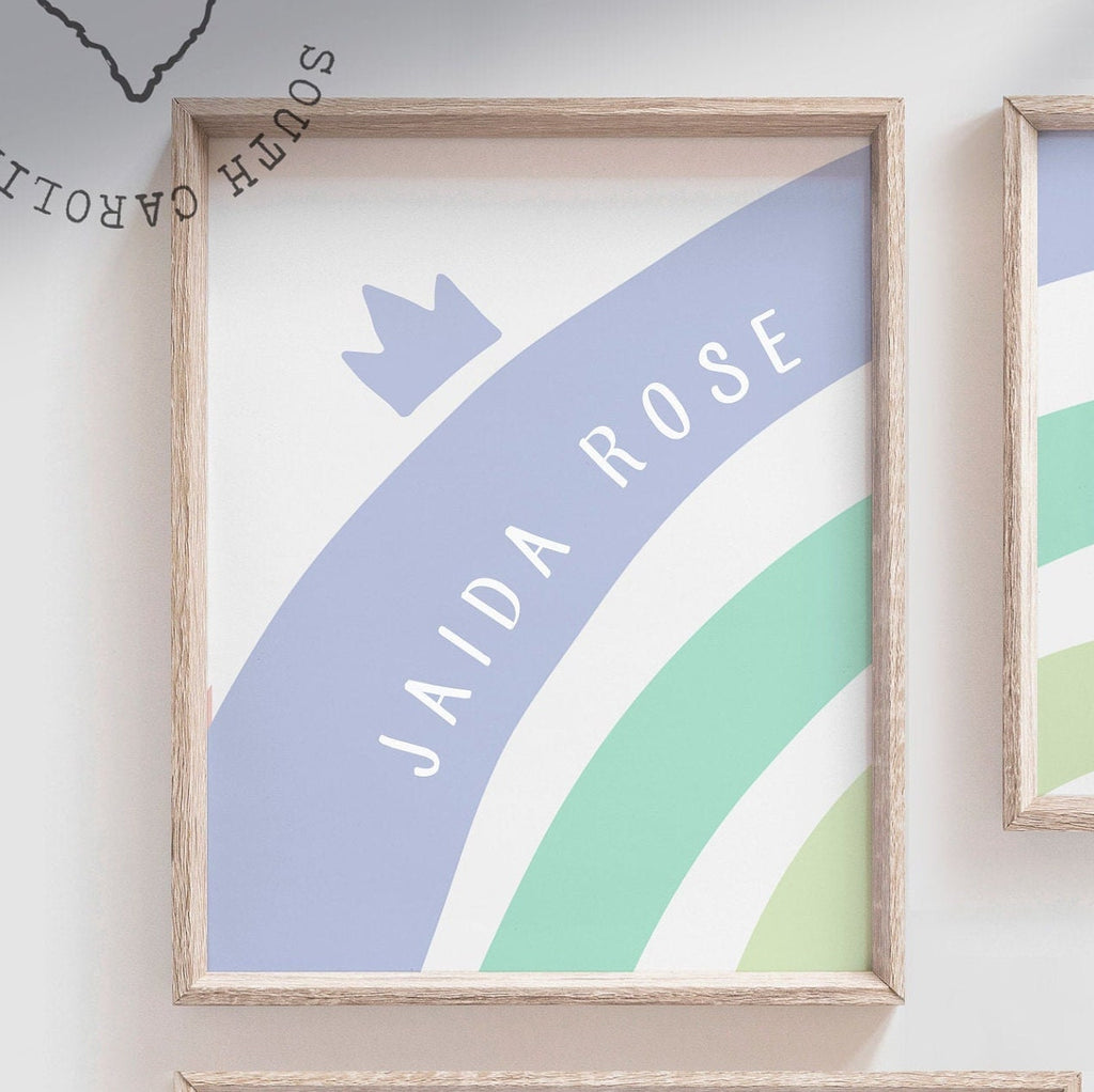 Product description: Rainbow design prints in a pastel color scheme with a heart and crown accents. The colors in this set were custom matched to a specific bedding for a customer. Matching personalized print to be customized with your child's name. If you like this design, and not sure what your baby's name is going to be yet, you can simply state to remove it altogether, or replace with a saying such as, "you are so loved." Other options are also available in my shop.