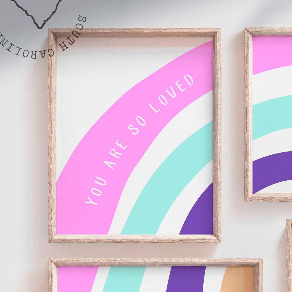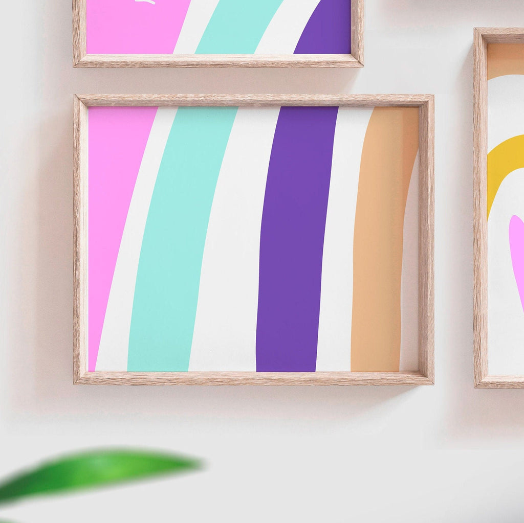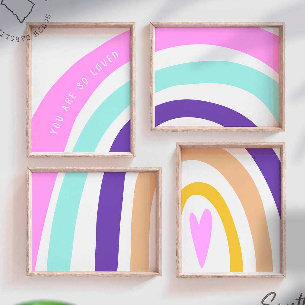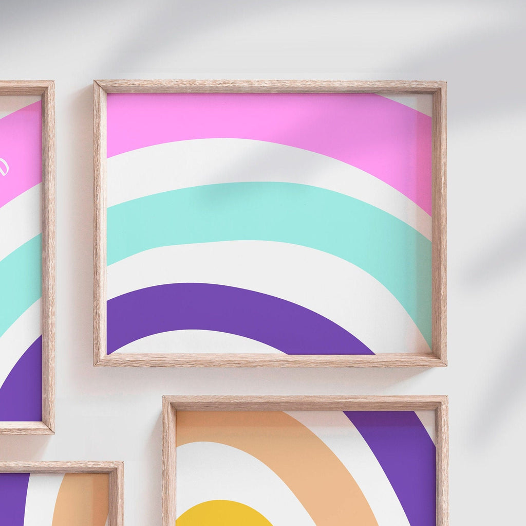 I take pride in creating all of my designs. These contemporary rainbow theme wall art prints will redefine the walls of a girl's nursery, playroom or bedroom. Each design is curated with a passion and vision to create inspired spaces for you and your little ones.