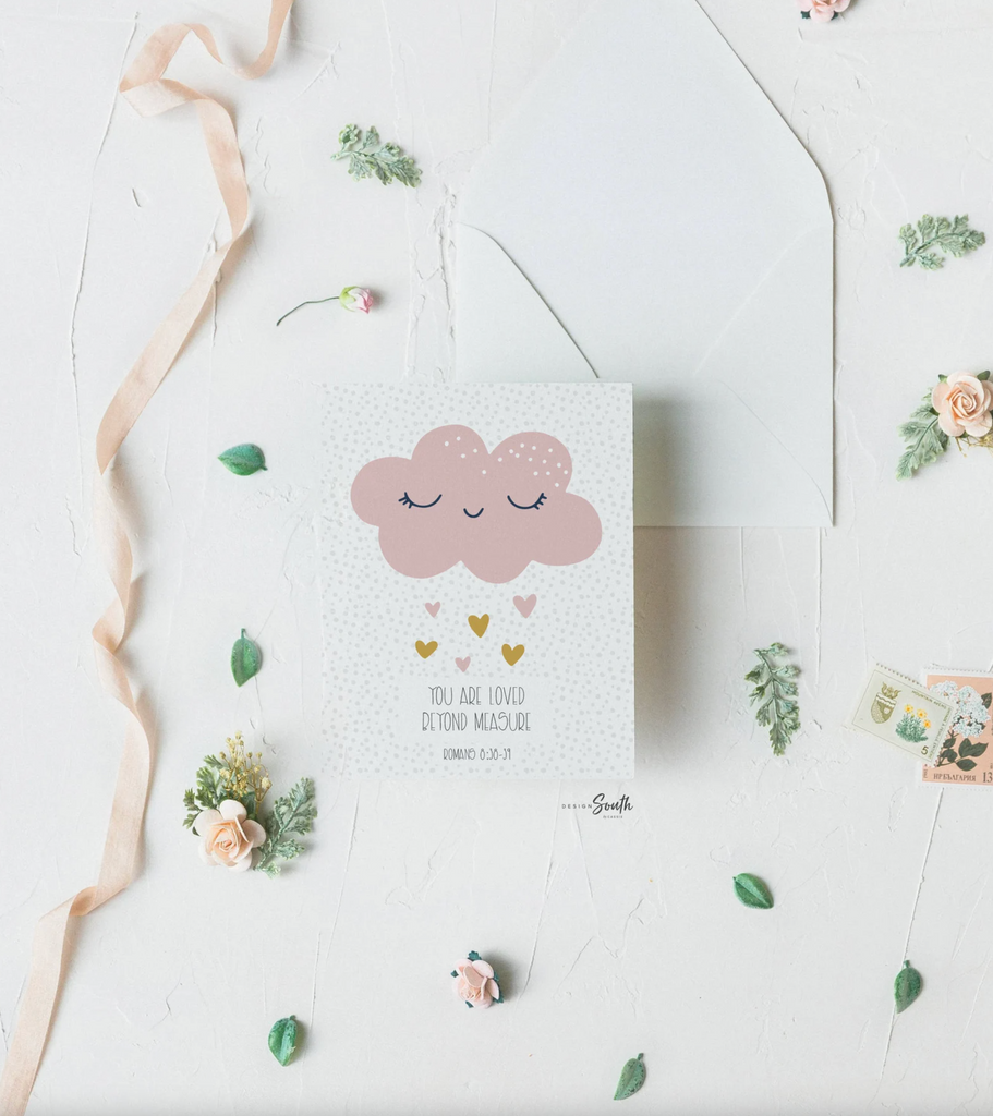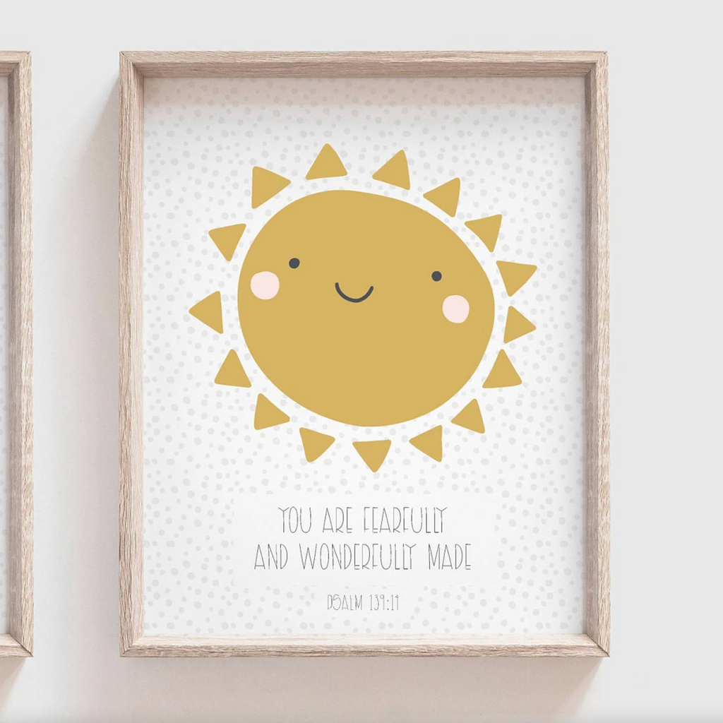 Product description: Wall art prints featuring a sleepy cloud, smiling sun, hearts, rainbow and bible verses reading, "You are loved beyond measure. ROMANS 8:38-39, You are fearfully and wonderfully made. PSALM 139:14, and God has great plans for you. ISAIAH 55:8-9." Other options are also available in my shop.