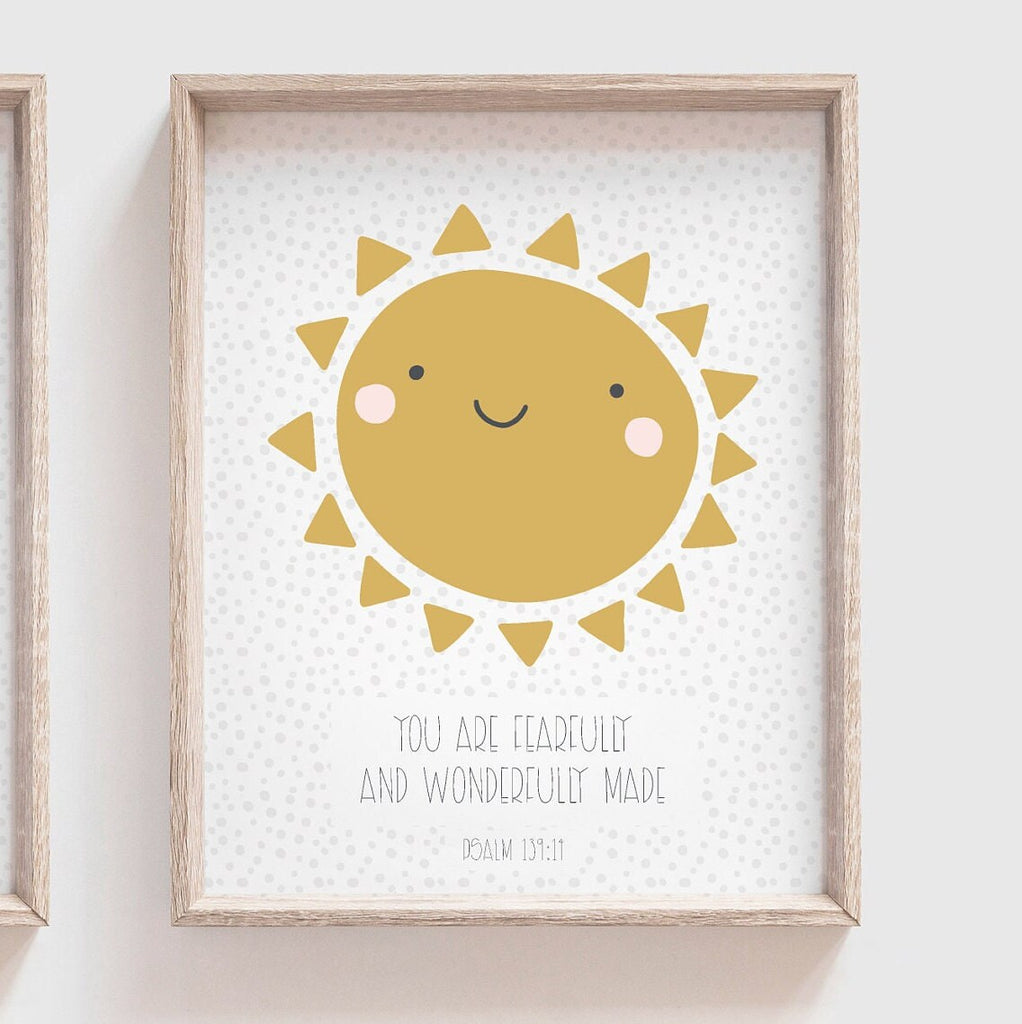 Product description: Wall art prints featuring a sleepy cloud, smiling sun, hearts, rainbow and bible verses reading, "You are loved beyond measure. ROMANS 8:38-39, You are fearfully and wonderfully made. PSALM 139:14, and God has great plans for you. ISAIAH 55:8-9." Other options are also available in my shop.