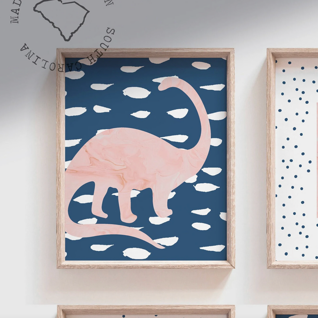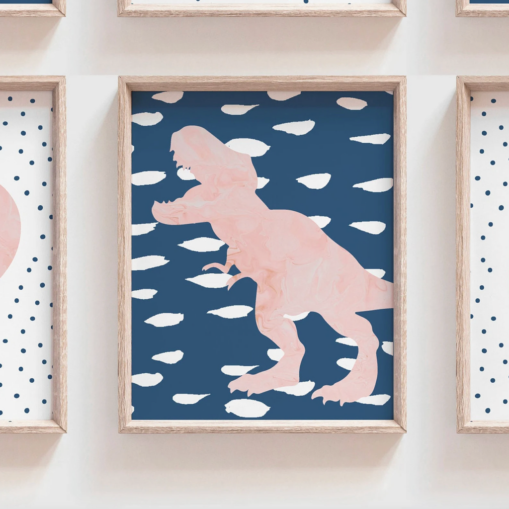 Little girl room pink & navy blue, dinosaur lover girl signs with name, rainbows hearts dots dinosaurs print set, dinosaur girl gallery wall