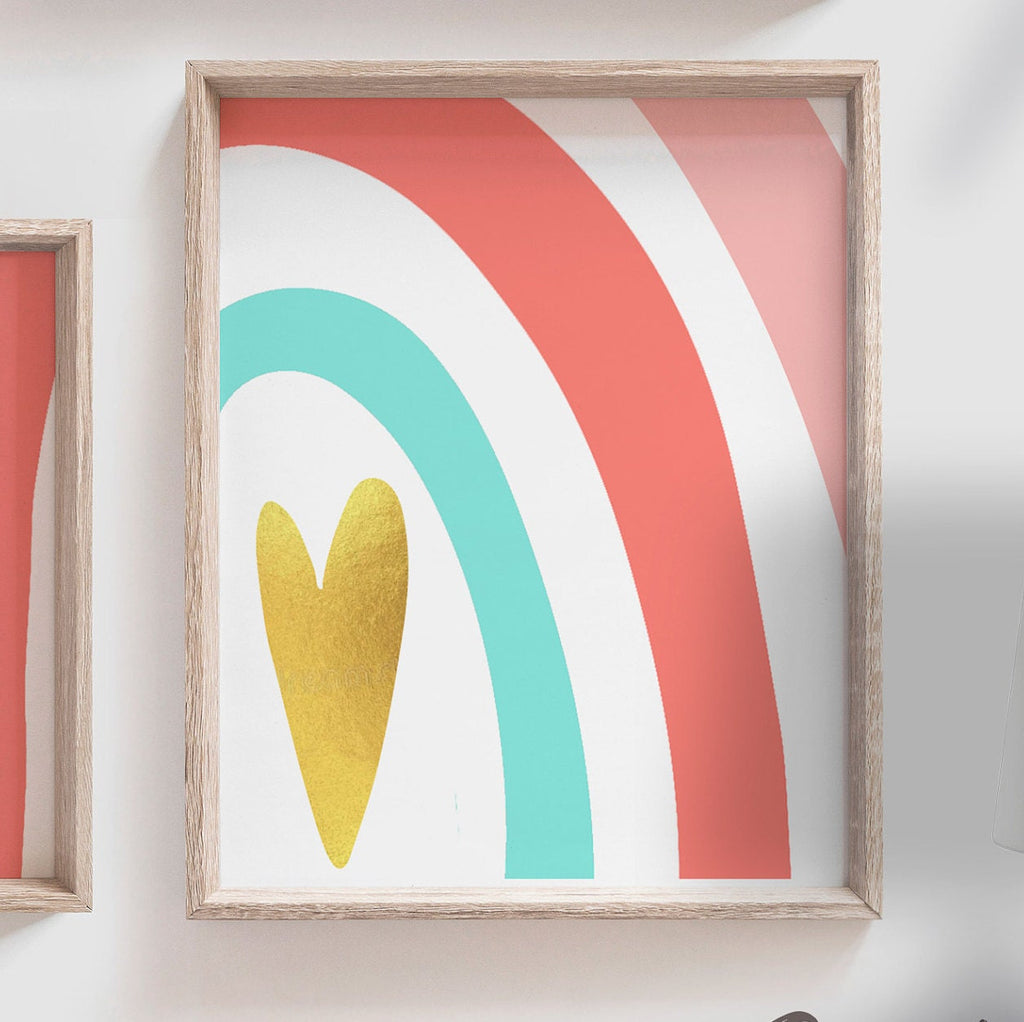 Product description: Rainbow design prints in shades of coral, baja, ballet and robin egg accented with gold foil heart. If you like this design, and not sure what your baby's name is going to be yet, you can simply state to remove it altogether, or replace with a saying such as, "you are so loved." Note: The item listed is created digitally. Gold foil nor sparkly paper was used in this design. High resolution photography of gold foil was used to create a 3D appearance of gold foil. Other options are also available in my shop.