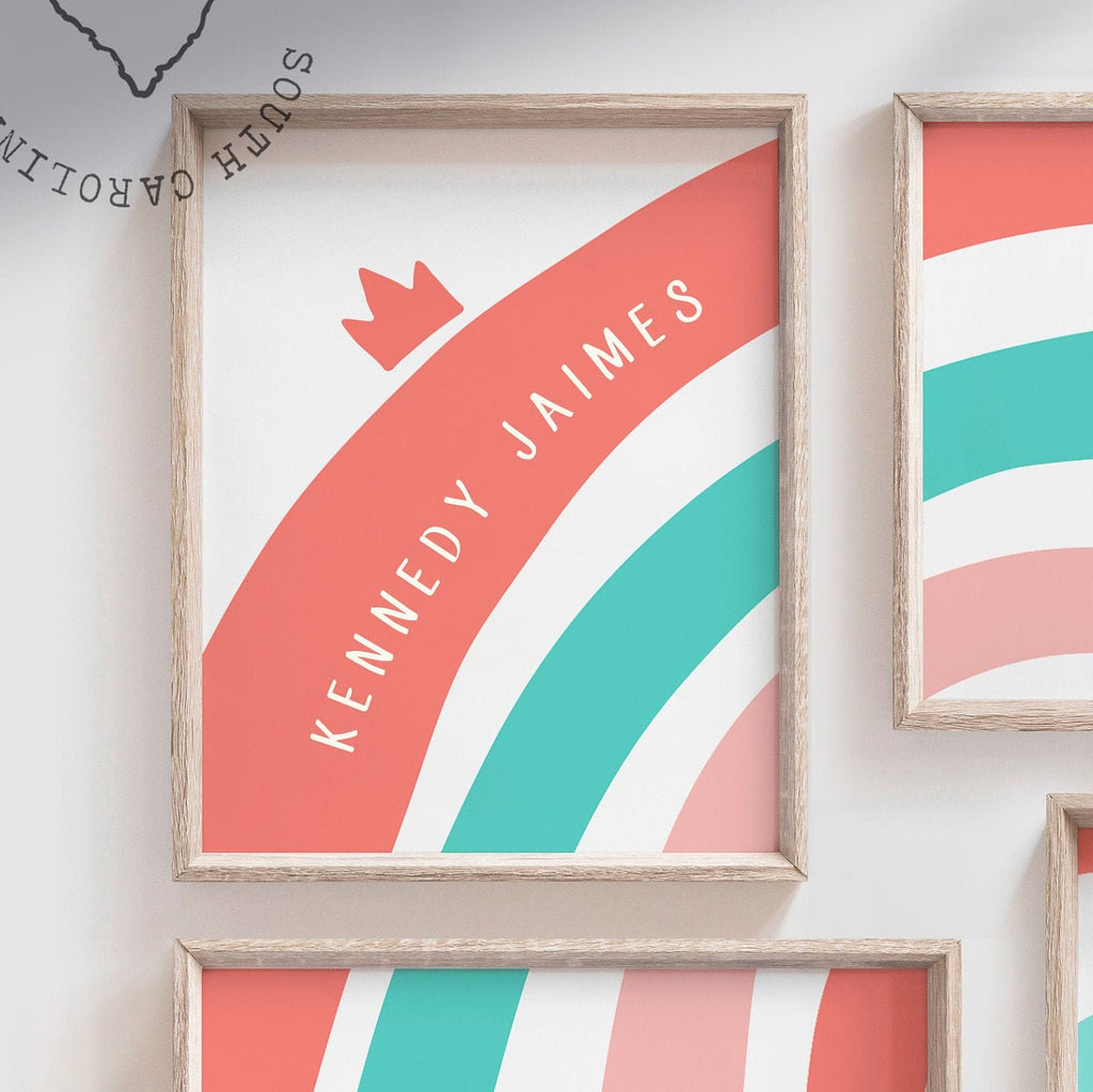 Coral teal aqua gold nursery, baby girl nursery decor coral teal, baby girl wall art theme coral teal aqua rainbow, personalized name gift