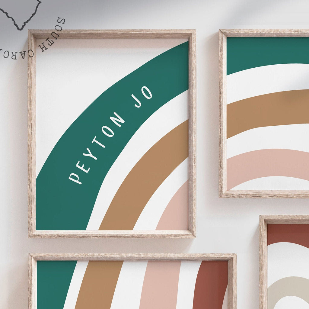 Emerald tan sienna kids art, gender neutral nursery personalized name, custom name kids room decor, wall art rainbow themed, child playroom