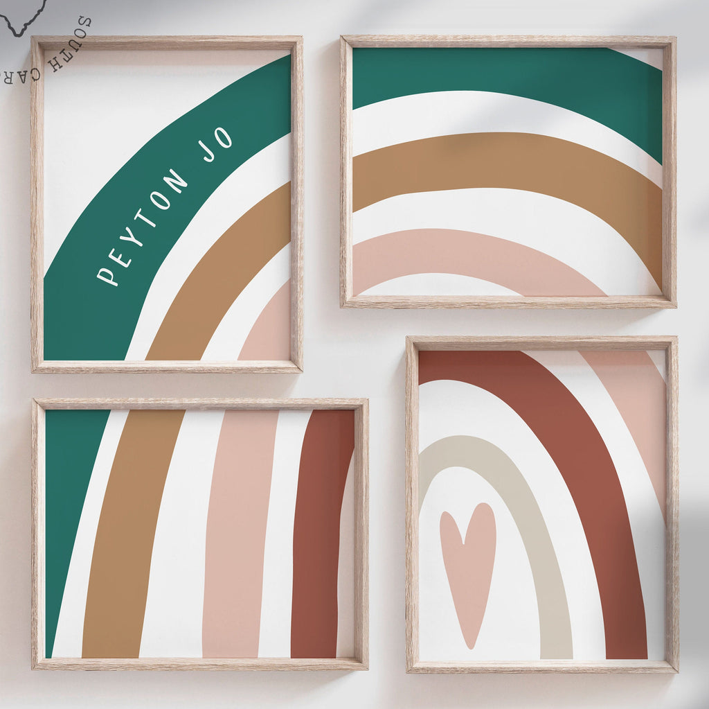 Product description: Rainbow design prints in a neutral color scheme with a heart accent. The colors in this set were custom matched to a specific bedding for a customer and are not on the color chart. Matching personalized print to be customized with your child's name. If you like this design, and not sure what your baby's name is going to be yet, you can simply state to remove it altogether, or replace with a saying such as, "you are so loved." Other options are also available in my shop.