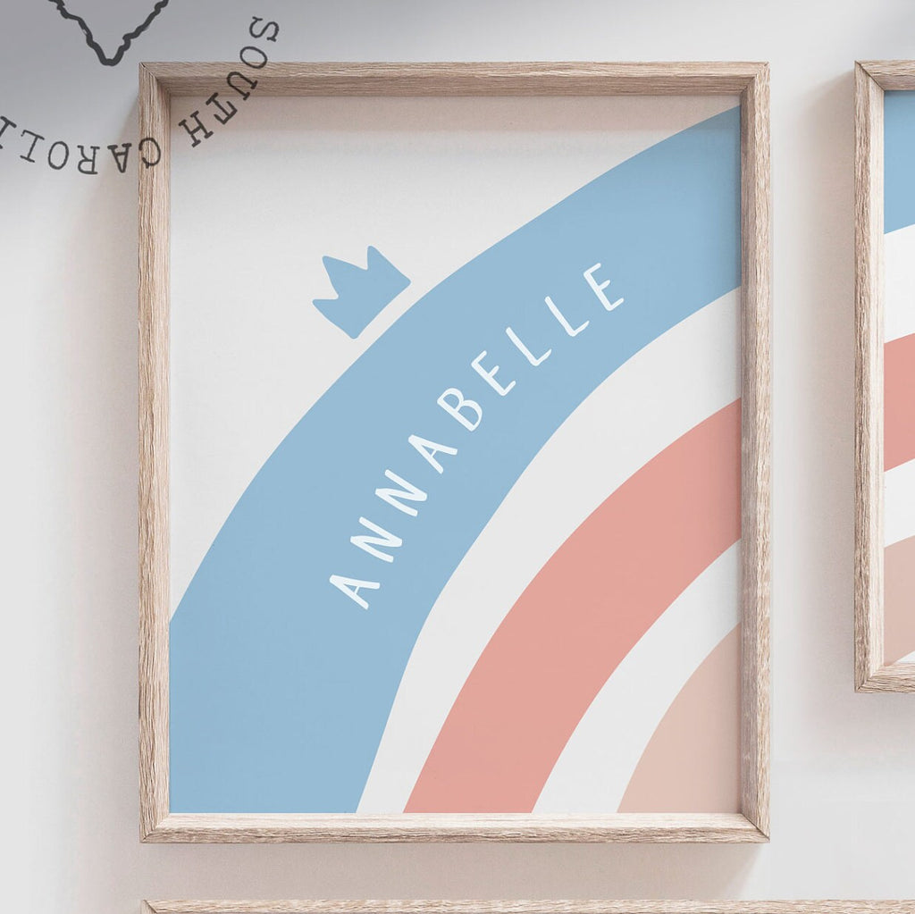 Product description: Rainbow design prints accented with a heart, crown and personalized name. The colors in this set were custom matched to a specific bedding for a customer. If you like this design, and not sure what your baby's name is going to be yet, you can simply state to remove it altogether, or replace with a saying such as, "you are so loved." Other options are also available in my shop.