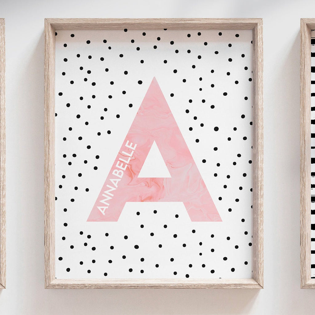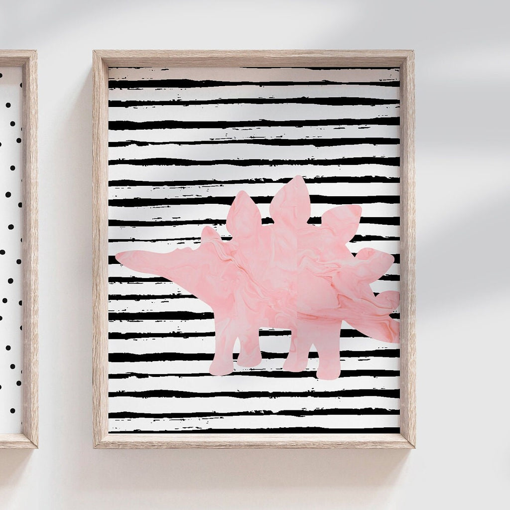 Product description: Trendy dinosaur wall art prints featuring a heart, rainbow, dinosaurs, black and white stroked paint, blush pink marble textures and personalized name and initial. Other options are also available in my shop.