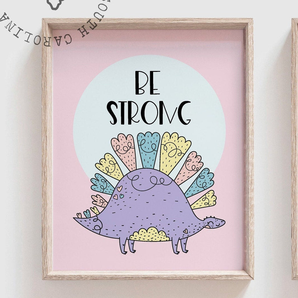 Product description: Adorable inspirational dinosaur art prints reading, "Be strong. Stand tall. Dream big. Be Kind. Be yourself. Seek adventure." Other options are also available in my shop.