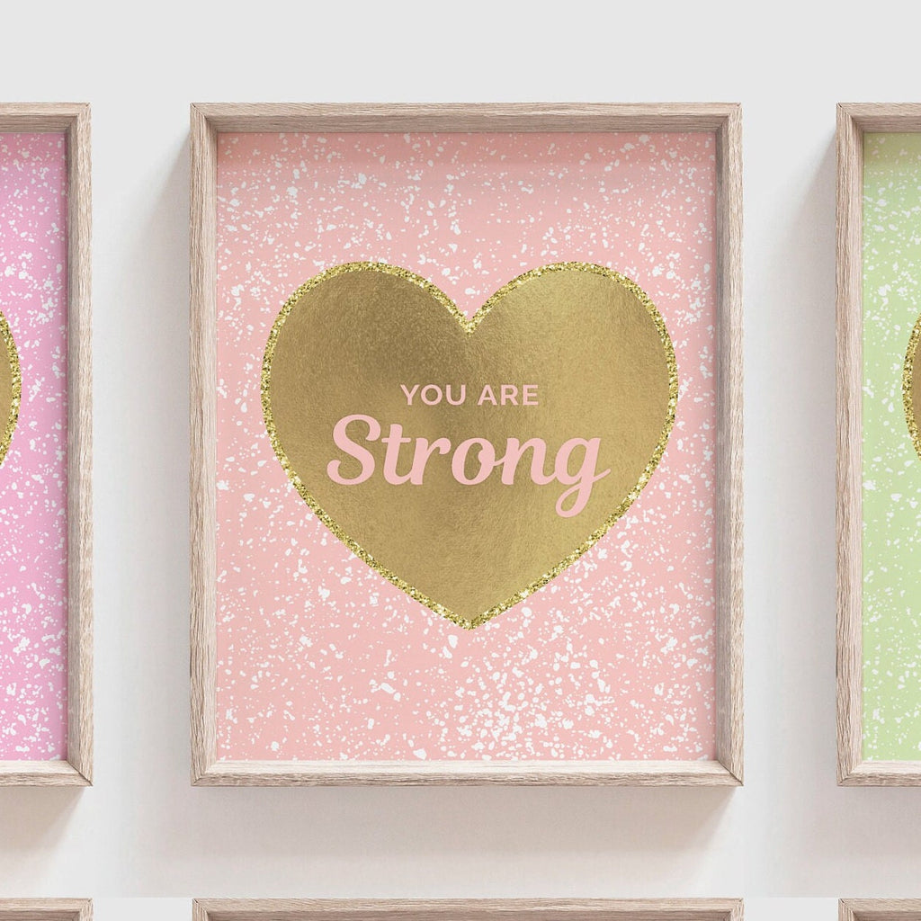 Product description: Inspirational themed prints featuring ink splatters, faux gold sparkle and foil hearts with inspirational quotes reading, "You are kind. You are brave. You are strong. You are loved. You are unique." Other options are also available in my shop. Other options are also available in my shop.