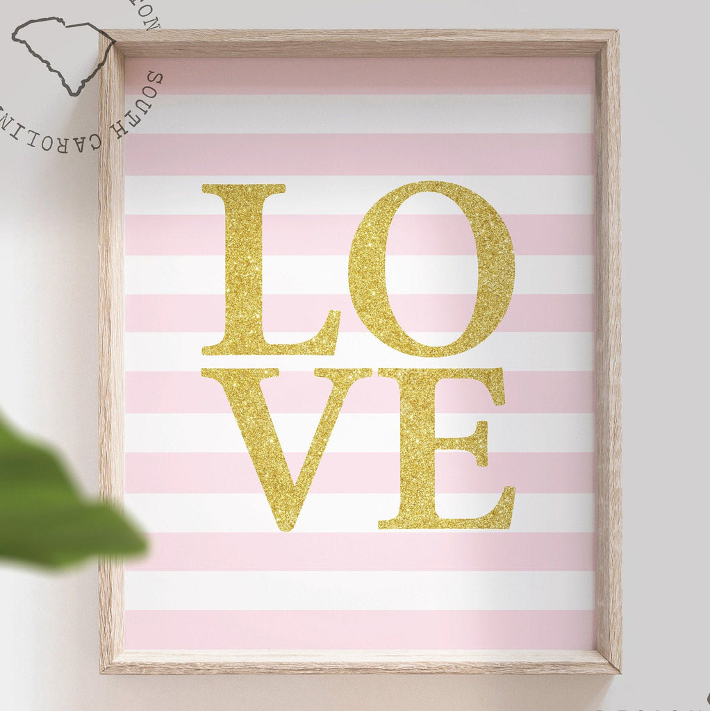 Love print, gold and pink love print, girls nursery decor, pink and gold, girls love nursery, girls nursery art, stripes, bathroom print