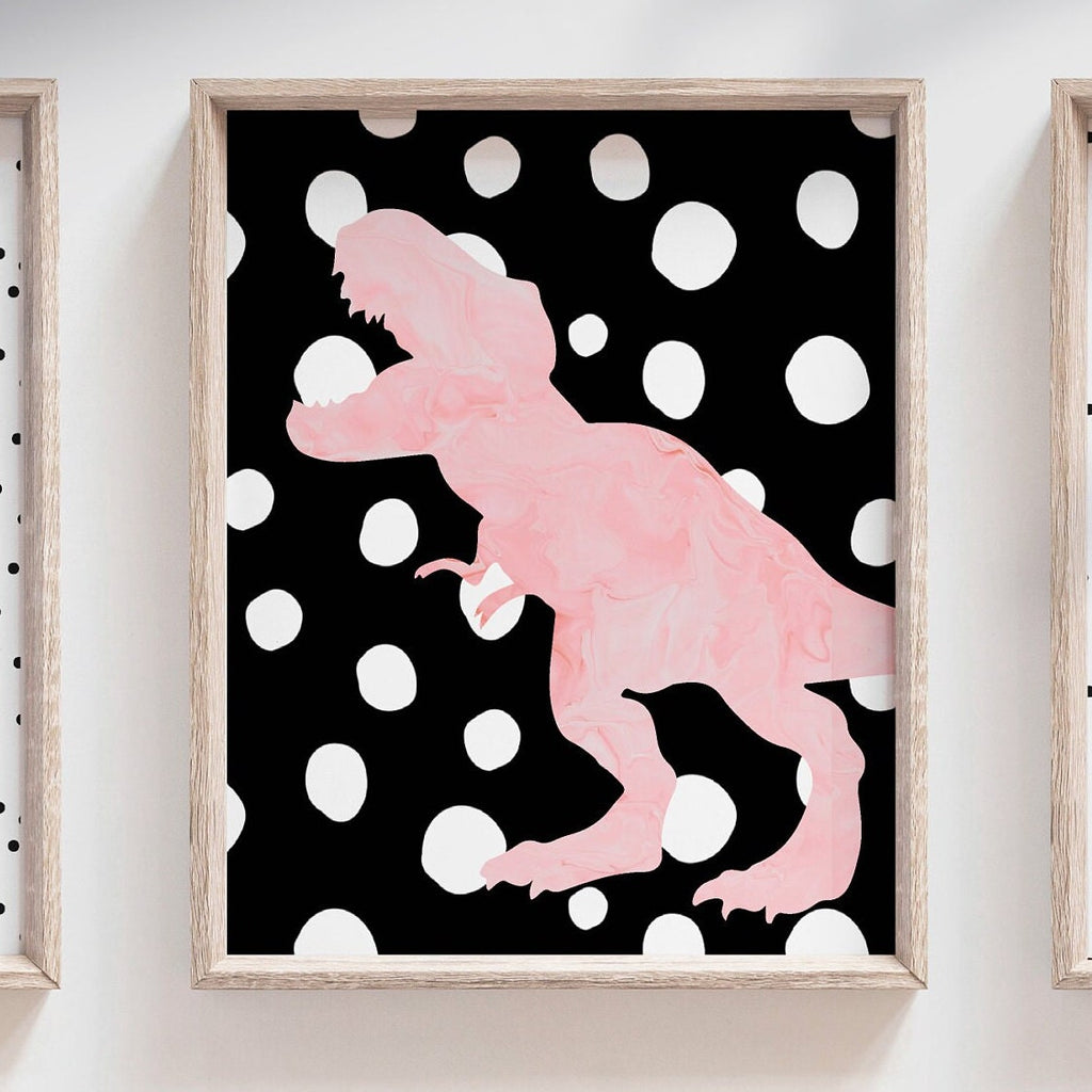 Modern trendy girl dinosaur art, pink black spotty dinosaur art, dinosaur nursery girl wall art, pink black dinosaur prints, dinosaur girl