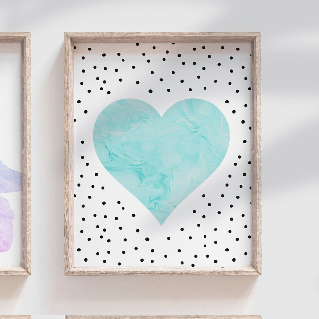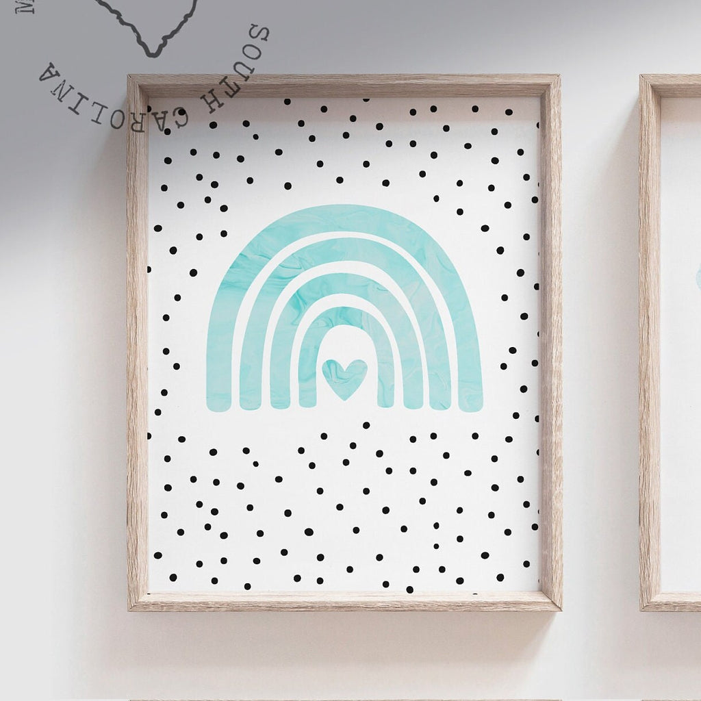Product description: Wall art prints featuring a rainbow, heart, crown and dinosaurs with purple and teal ombre watercolor backgrounds and small polka dots. Other color options are also available in my shop.