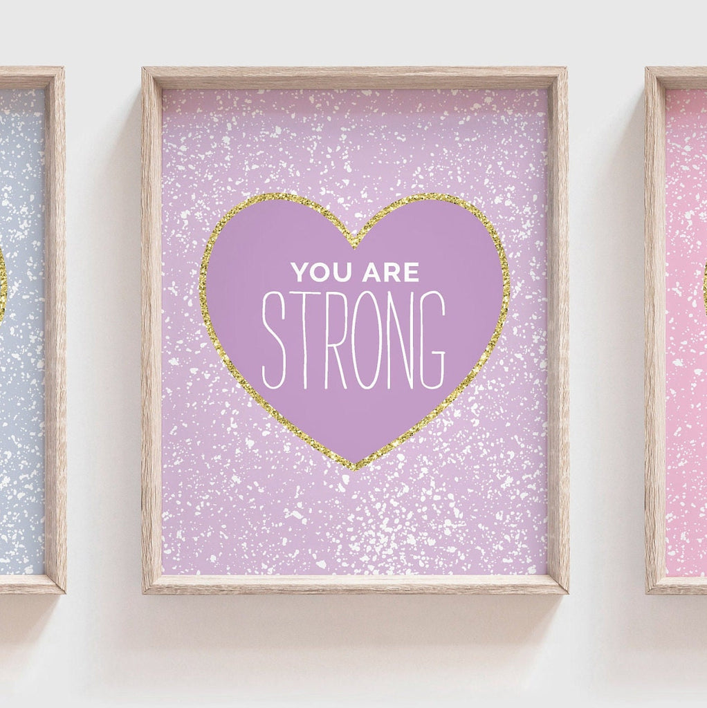Pink purple and blue girls room decor, wall art for girls heart themed print, set of 3 girls art prints, you are smart strong loved wall art