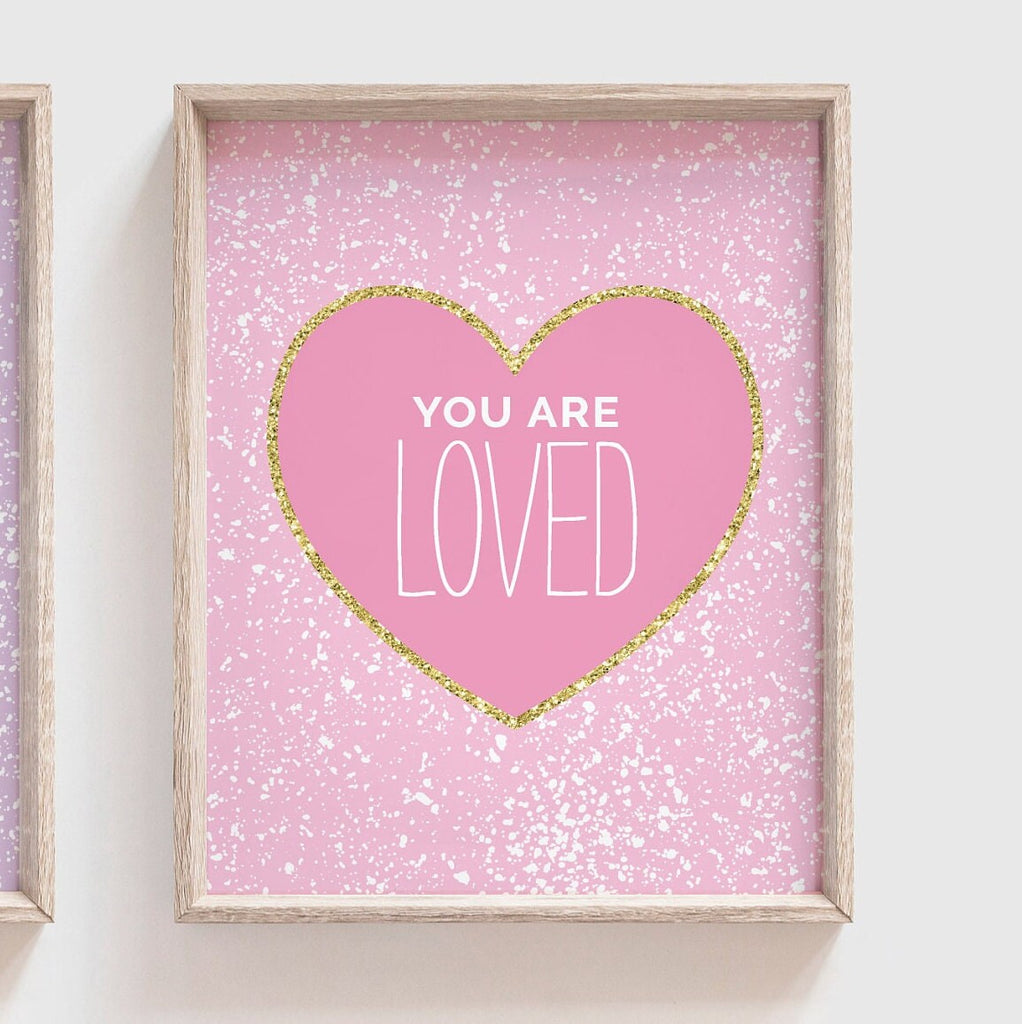 Product description: Girl's heart wall art prints theme prints featuring faux gold sparkles, white splattered ink and inspirational sayings reading, "You are smart. You are loved. You are brave." Colors used in this listing are Fearless, Lovely and Bubblegum. Other options are also available in my shop.