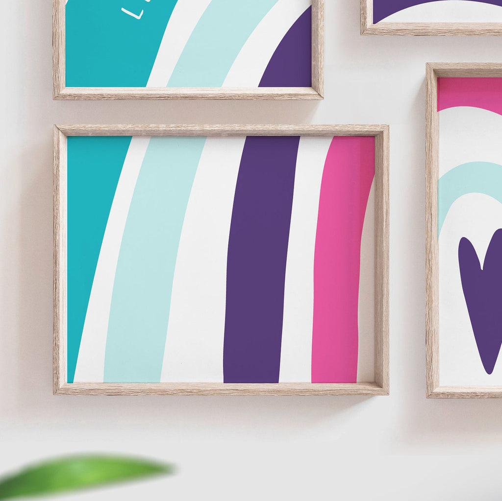 I take pride in creating all of my designs. These contemporary rainbow theme wall art prints will redefine the walls of a girl's nursery, playroom or bedroom. Each design is curated with a passion and vision to create inspired spaces for you and your little ones.