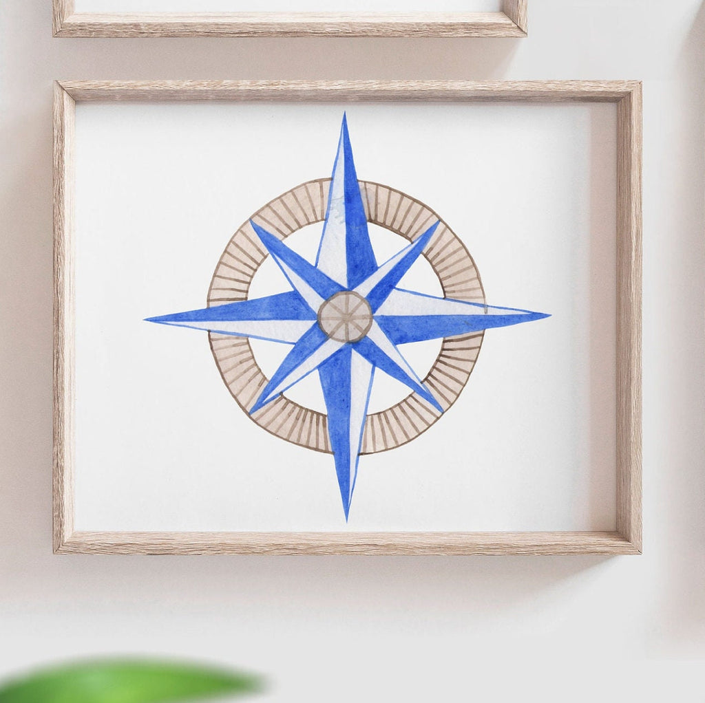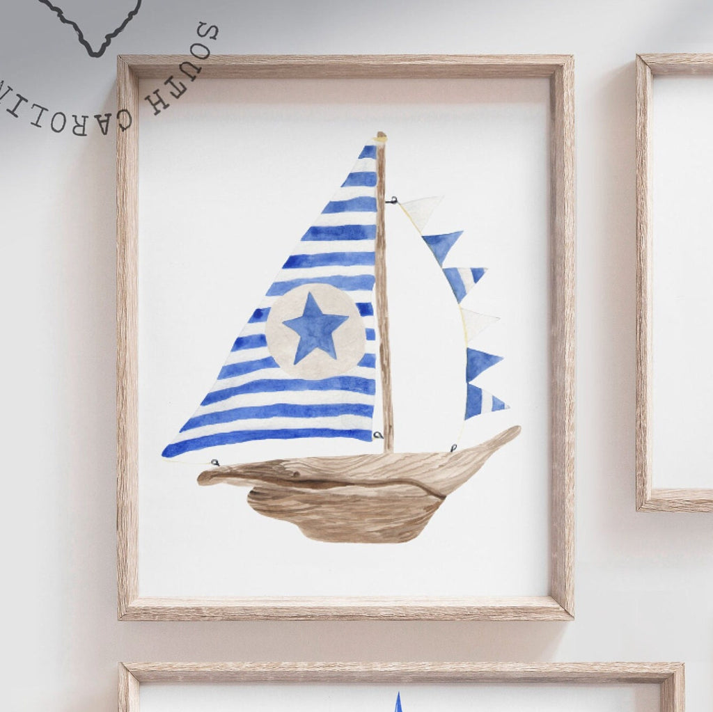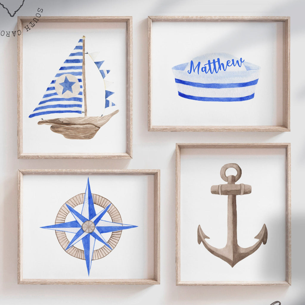 Product description: Nautical themed art prints featuring an illustrated watercolor wooden sailboat, anchor, compass and a sailor's cap to be customized with your child's name. You can request to remove the name if desired. Other options are also available in my shop.