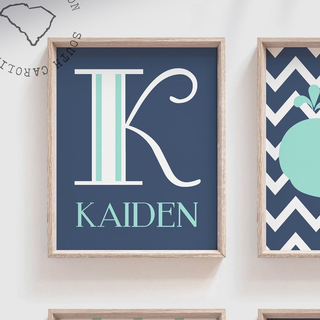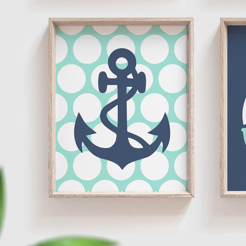 Product description: Nautical art prints in colors vibrant mint and soft navy featuring a whale, sailboat, anchor and shipwheel with matching monogram print to be customized with your child's name. Other options are also available in my shop.