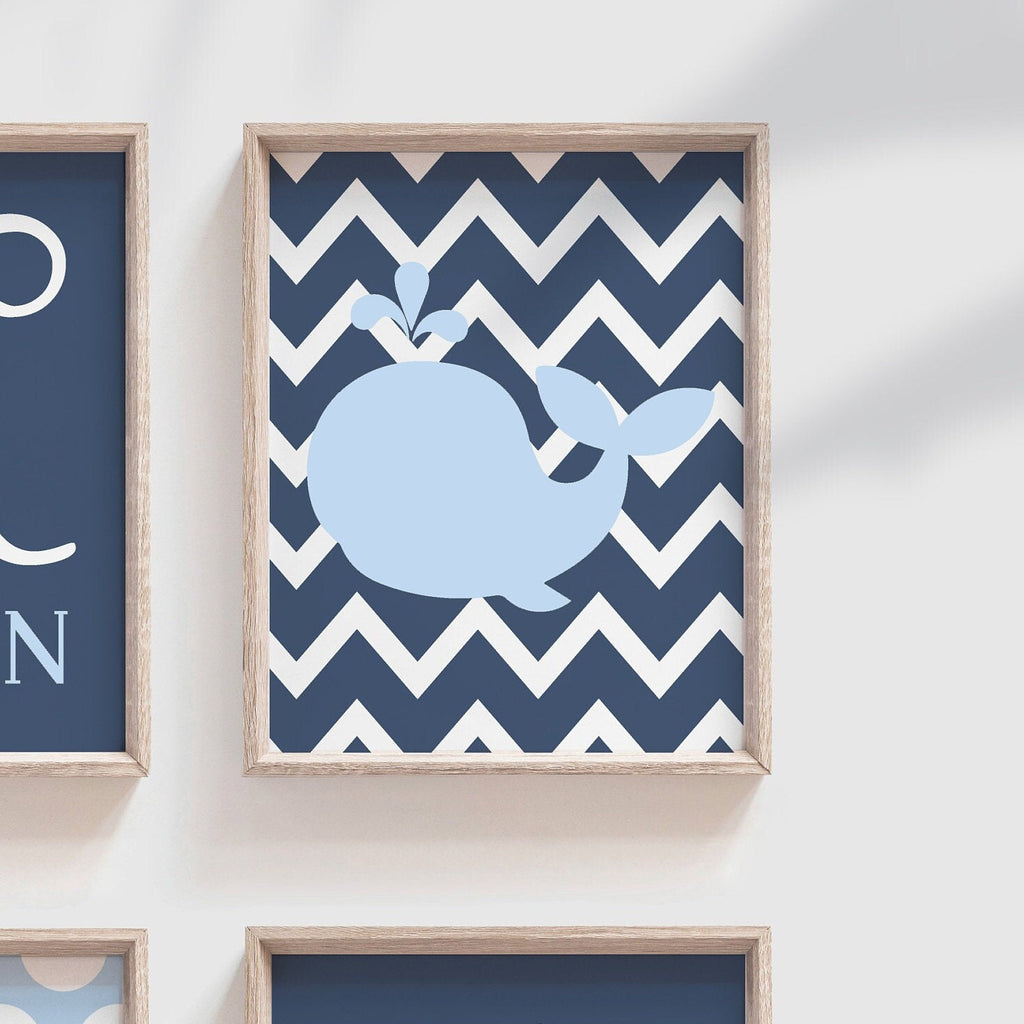 Product description: Nautical art prints in colors baby blue and soft navy featuring a whale, sailboat, anchor and shipwheel with matching monogram print to be customized with your child's name. Other options are also available in my shop.