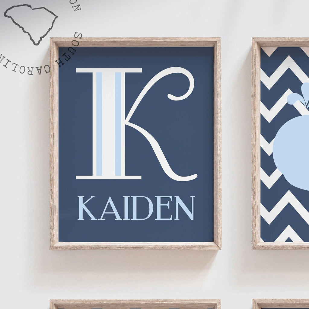 Baby boy nautical nursery, personalized art for boy, anchor navy blue nautical nursery, initial and name print, boys nautical art navy blue