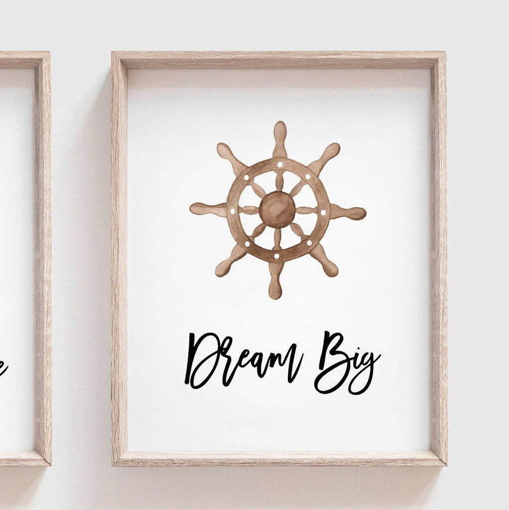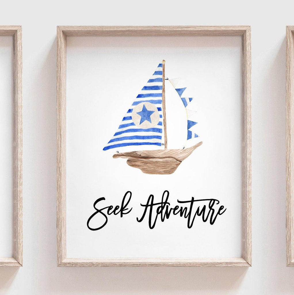 Product description: Nautical themed wall art prints with white backgrounds and inspirational sayings that read, "Be Strong. Dream Big. Seek Adventure." Other options are also available in my shop.