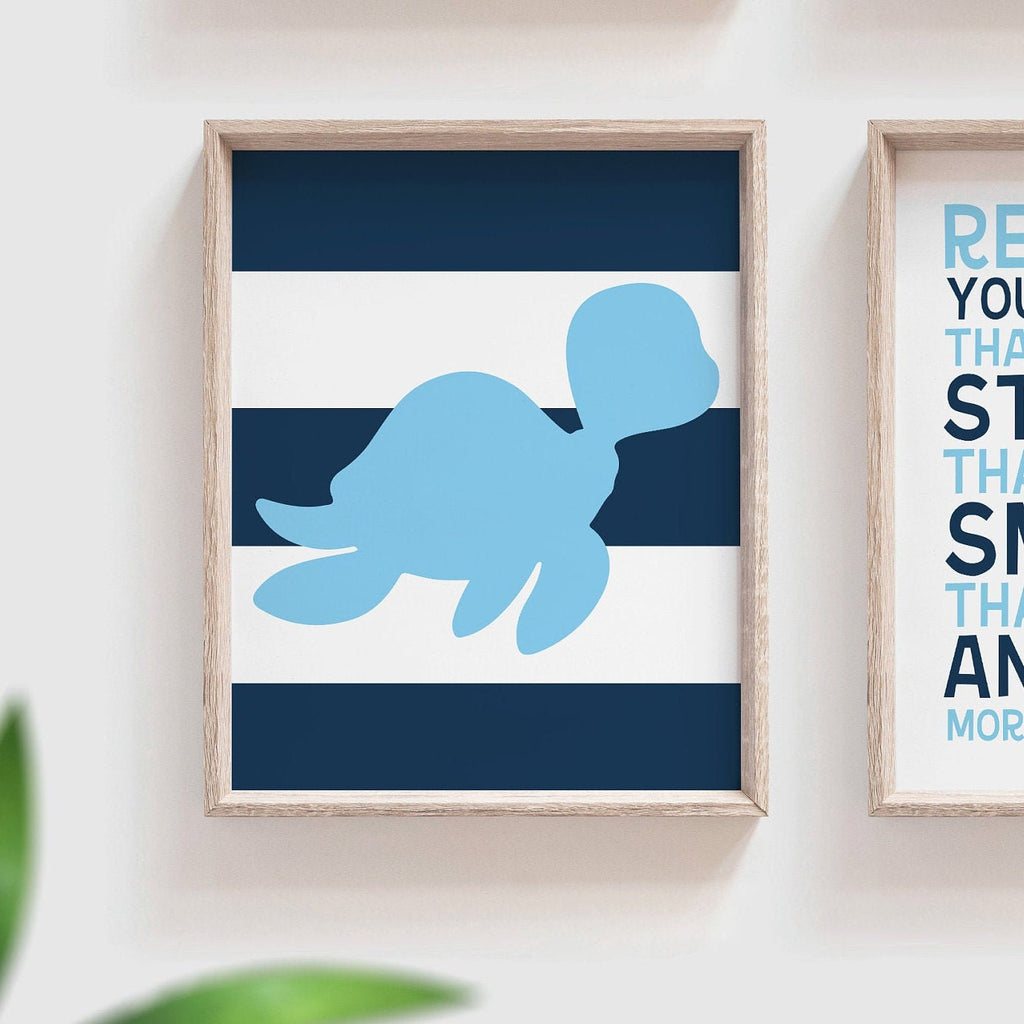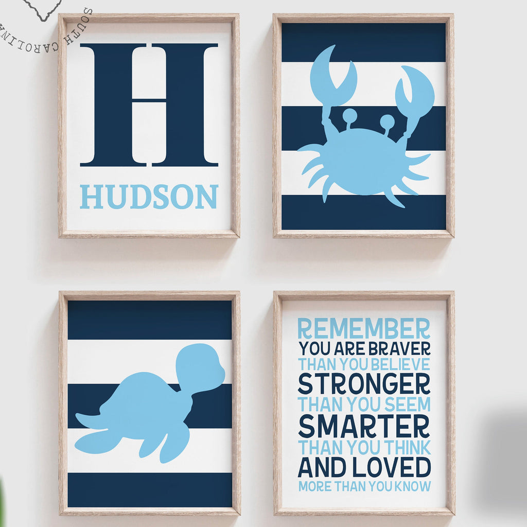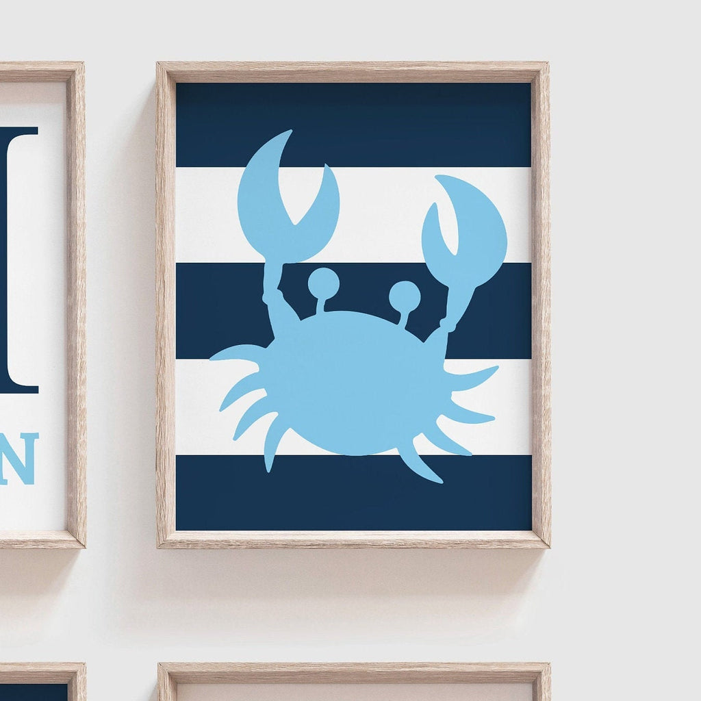 Product description: Nautical theme prints including a crab and a turtle in navy blue and dusk blue with thick striped backgrounds. Personalized name print and matching quote. Other color options are also available.