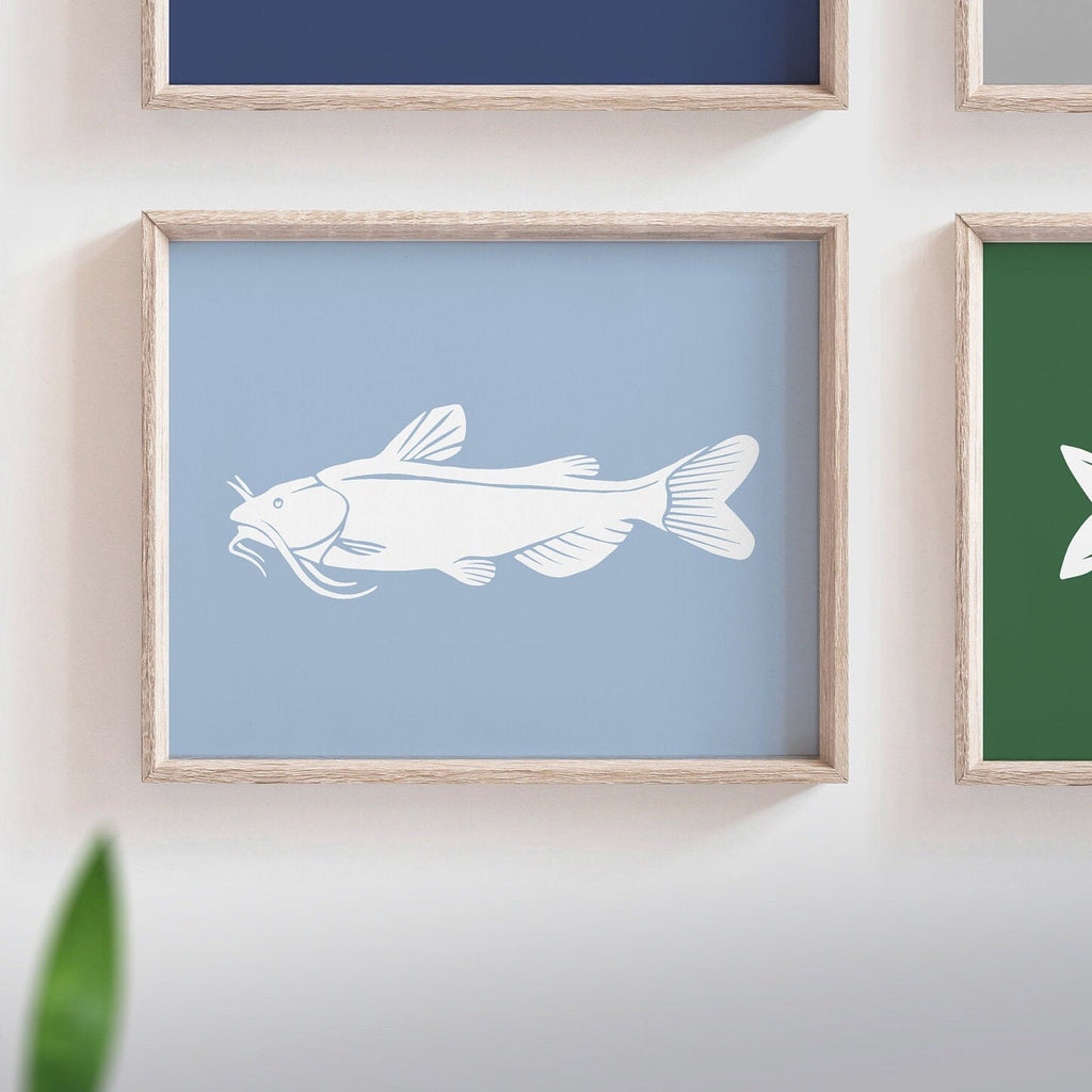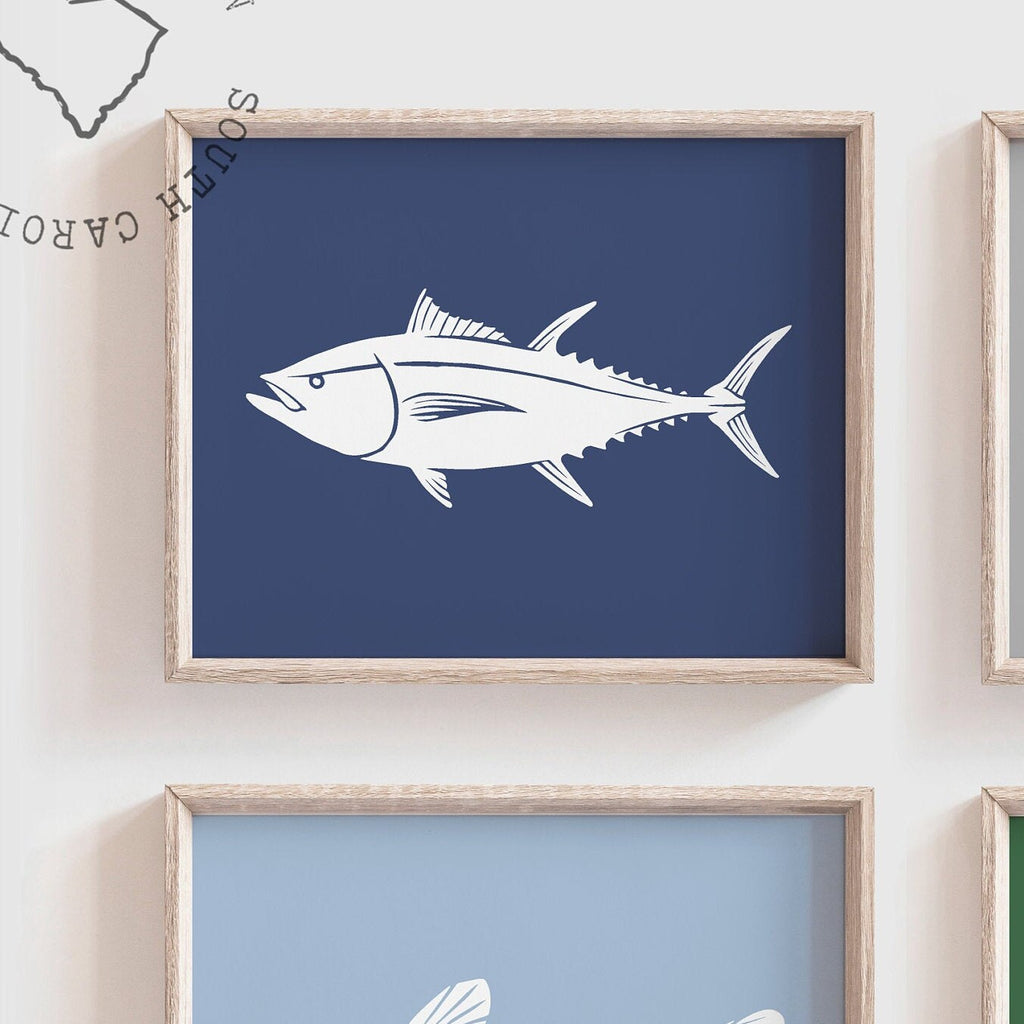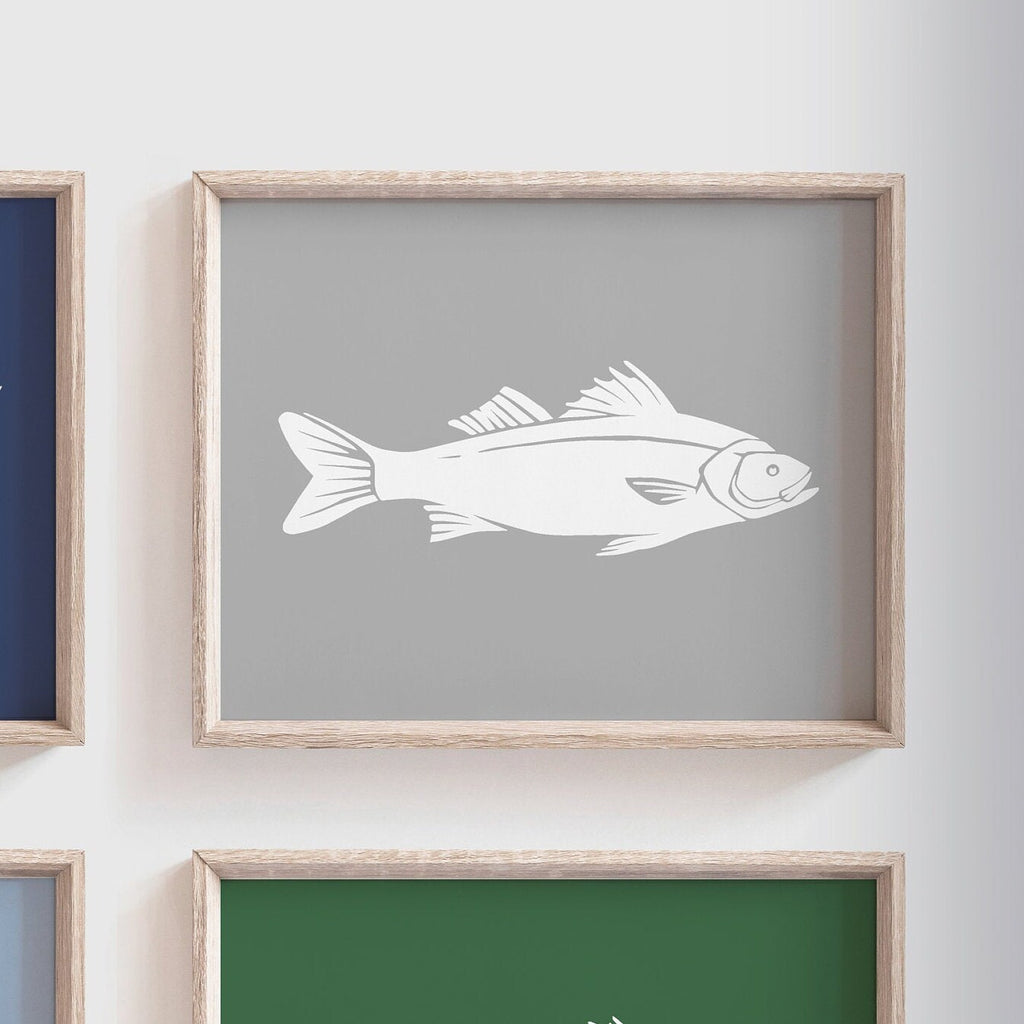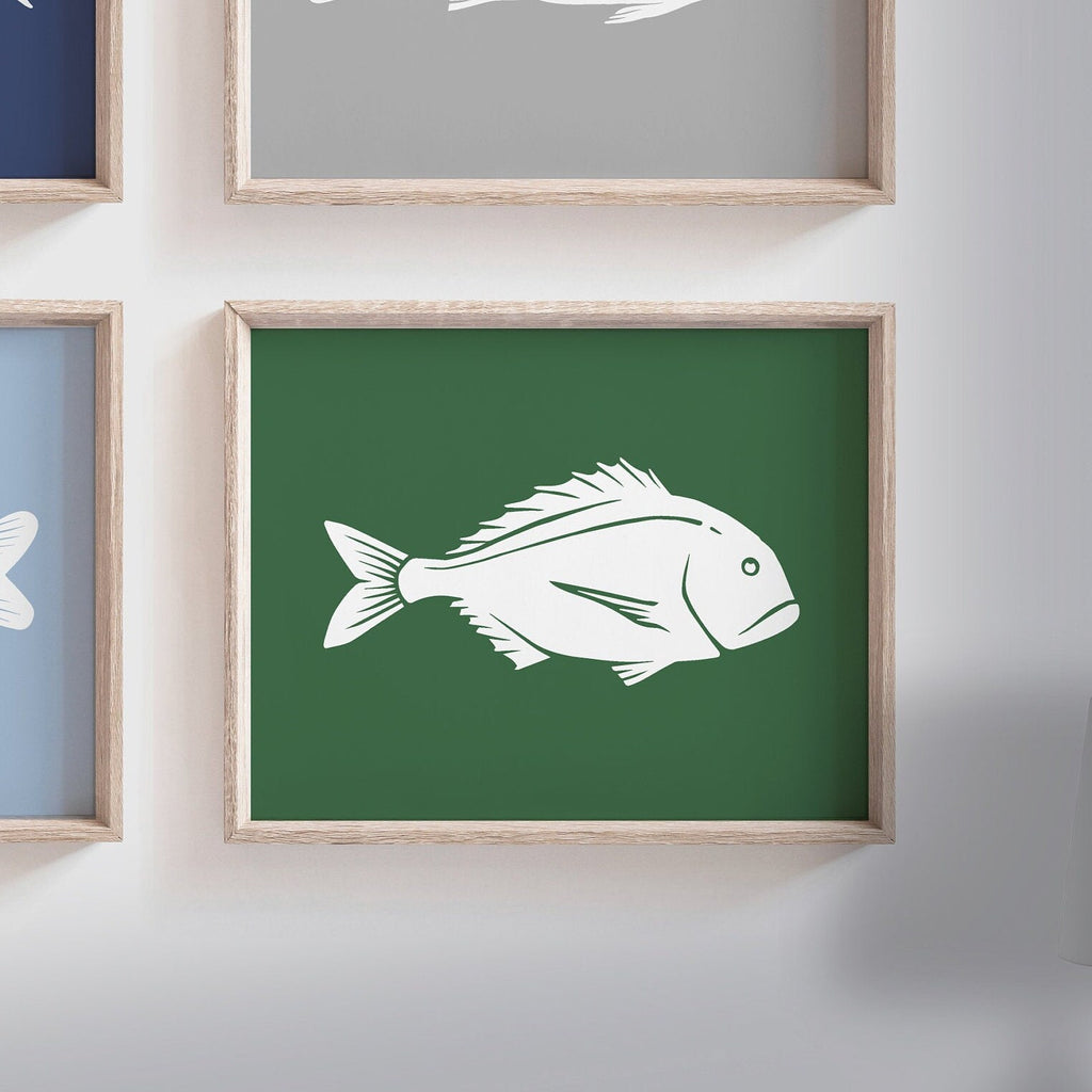 Product description: Fish theme prints including a catfish, sea bass, sea bream and tuna in smoke, soft navy, cloudy blue, forest green. Other color options are also available in my shop.