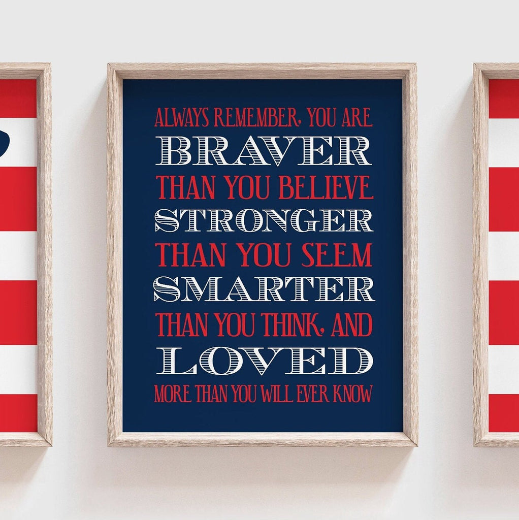 Product description: Shark designs in navy blue and red with thick striped backgrounds. Matching quote reading "Remember you are braver than you believe, stronger than you seem, smarter than you think, and loved more than you know." Other color options are available.