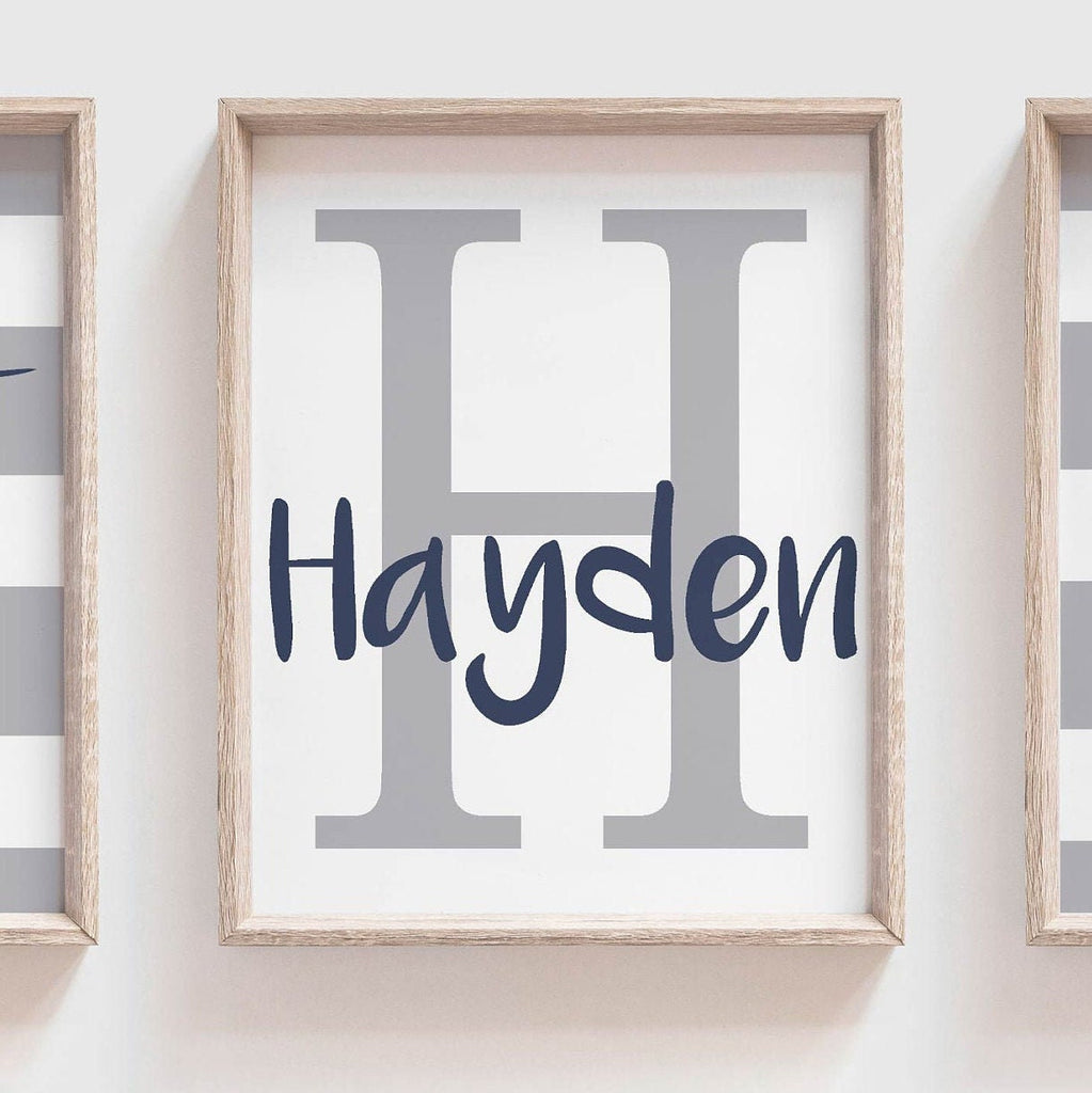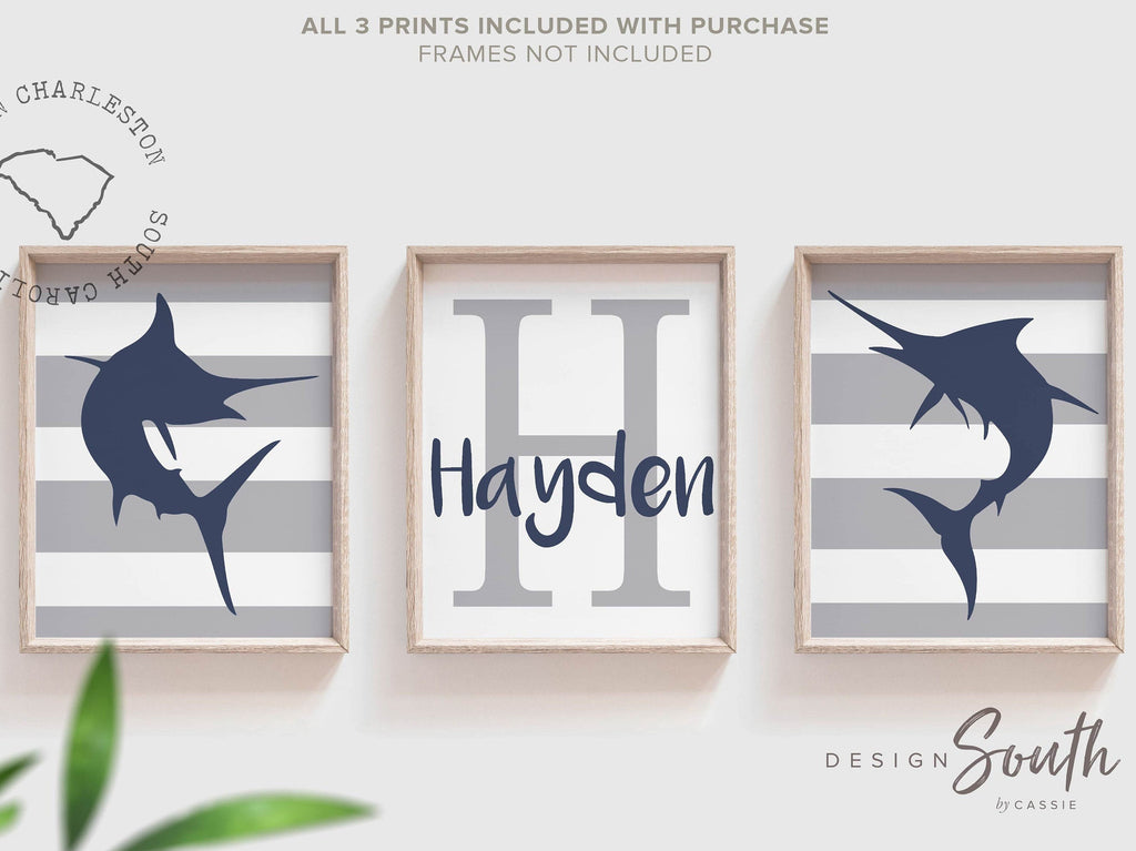 Product description: Marlin prints in soft navy blue and smoke gray with thick striped backgrounds. Center print is personalized with your child's name and initial. Other color options are also available in my shop.