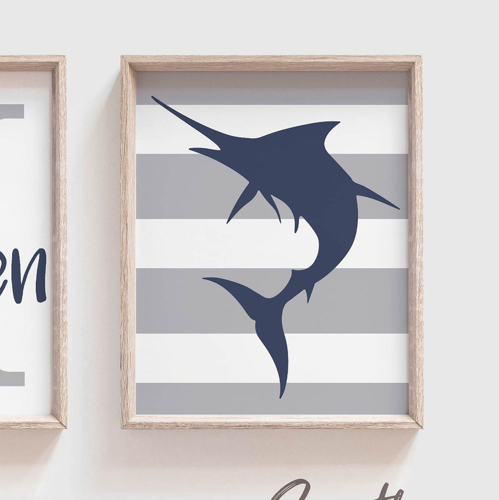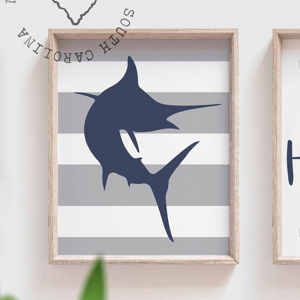 Fish nursery decor, deep sea fish nursery, nautical, fish theme, marlin boys art, marlin nursery decor, navy blue and gray, marlin nursery